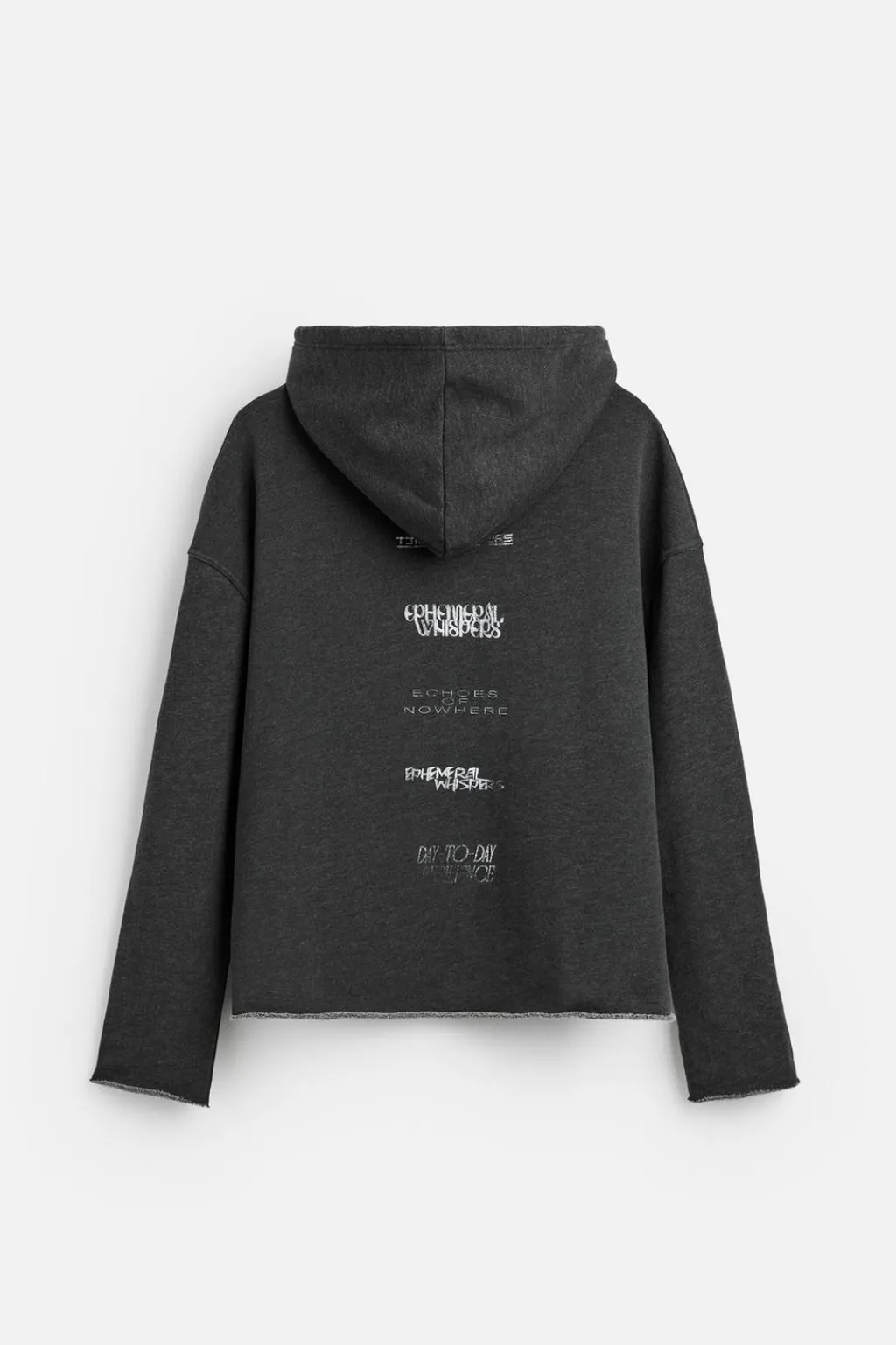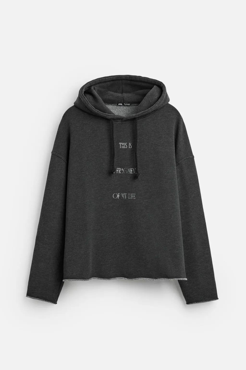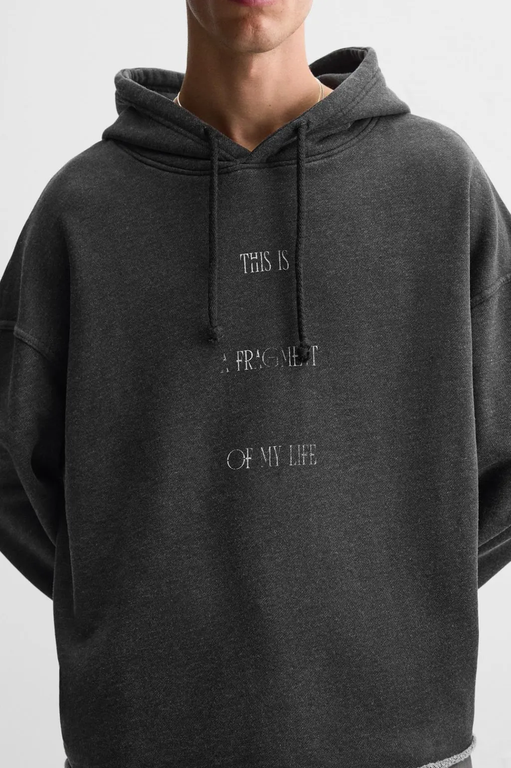 Sudadera hoodie boxy fit. Cuello con capucha ajustable y manga larga. Estampación frontal combinada a contraste. Efecto lavado. Acabados irregulares.