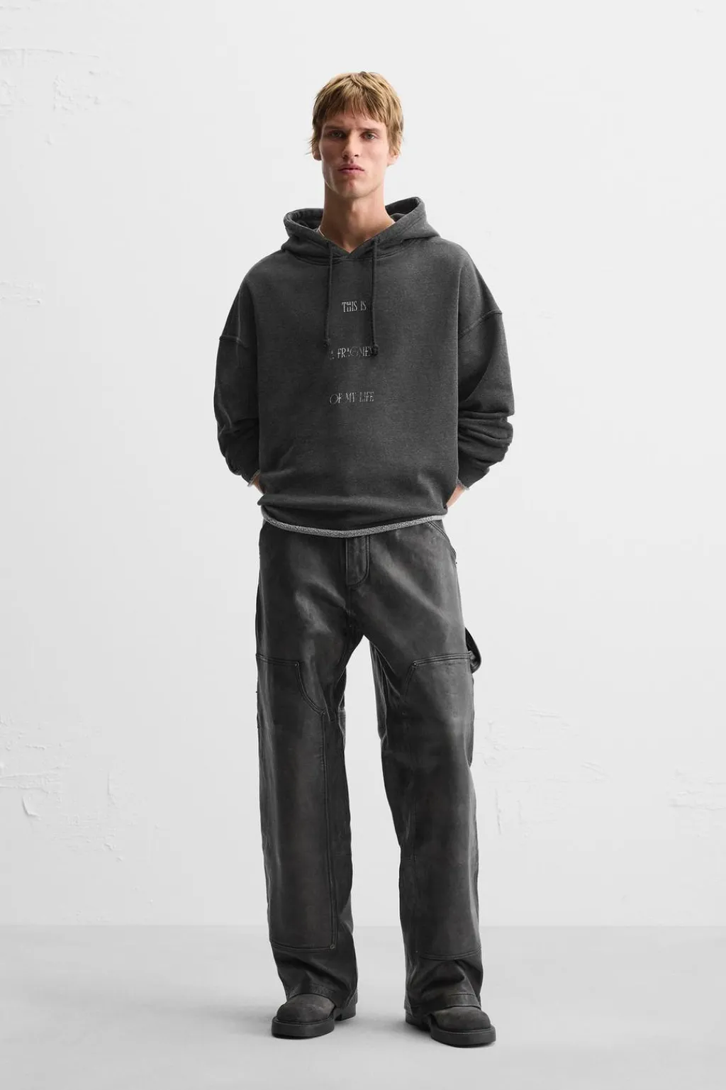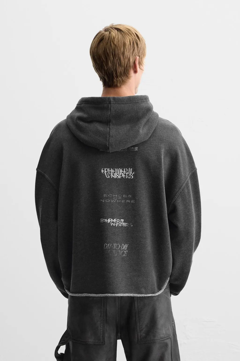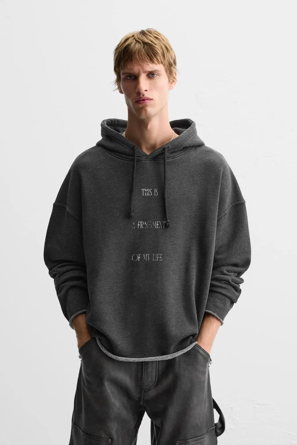 Sudadera hoodie boxy fit. Cuello con capucha ajustable y manga larga. Estampación frontal combinada a contraste. Efecto lavado. Acabados irregulares.