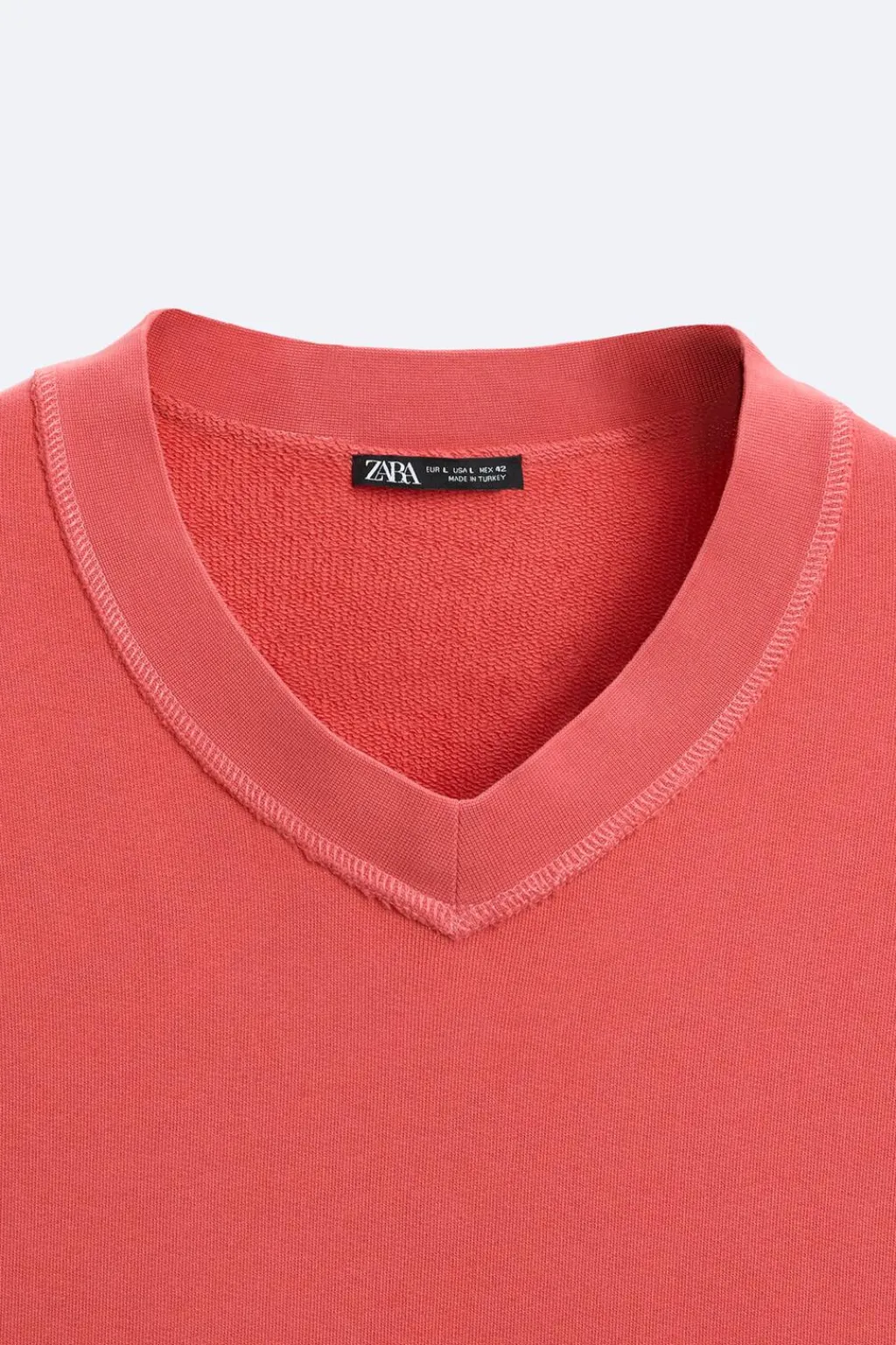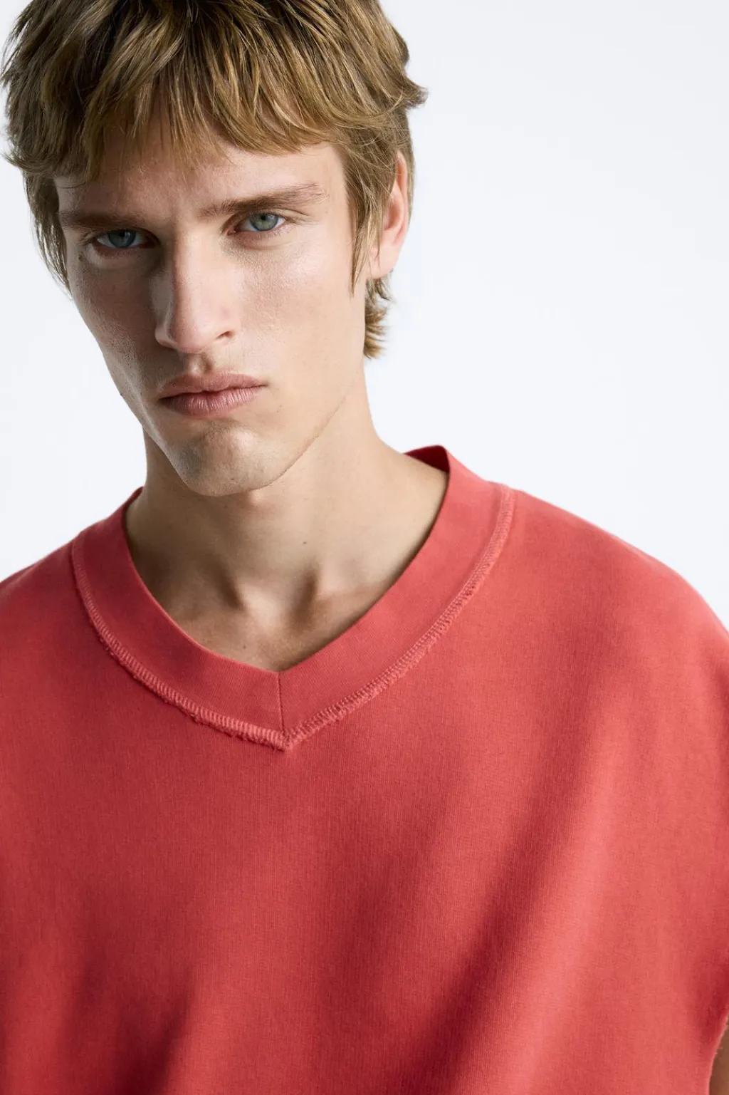 Sudadera cropped fit. Cuello rpico acabado en rib. Manga sisa. Estampación combinada a contraste en espalda. Acabados irregulares. Efecto lavado.