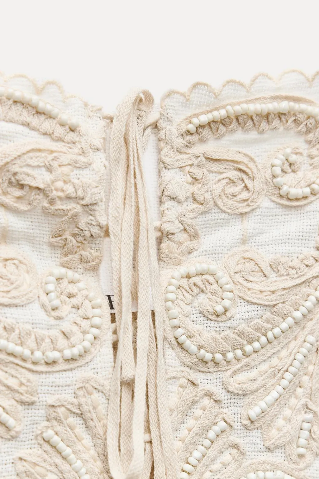 Top tipo corsé de escote recto y tirantes anchos. Detalle de bordados combinados a contraste y aplicación de abalorios a tono. Acabados en ondas. Cierre frontal con lazada.