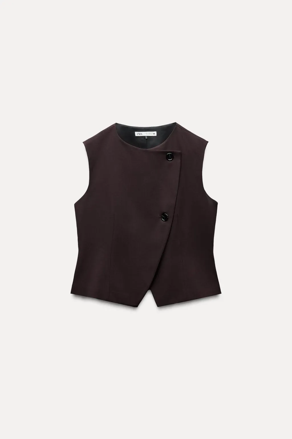 Top tipo chaleco confeccionado en hilatura con viscosa. Cuello redondo y manga sisa. Forro interior. Bajo asimétrico. Cierre frontal cruzado con botones.
