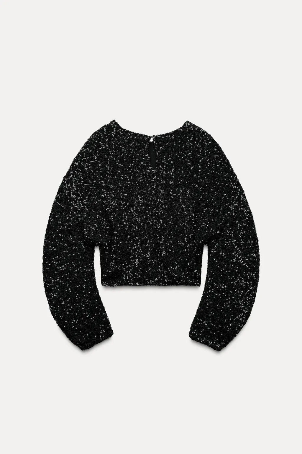 Top crop de cuello redondo y manga larga. Detalle aplicación lentejuelas. Forro interior combinado. Cierre en espalda con abertura y botón.