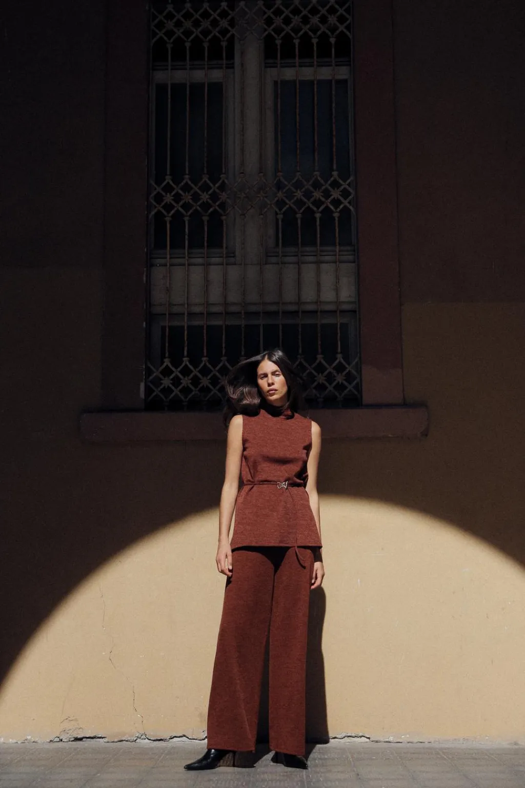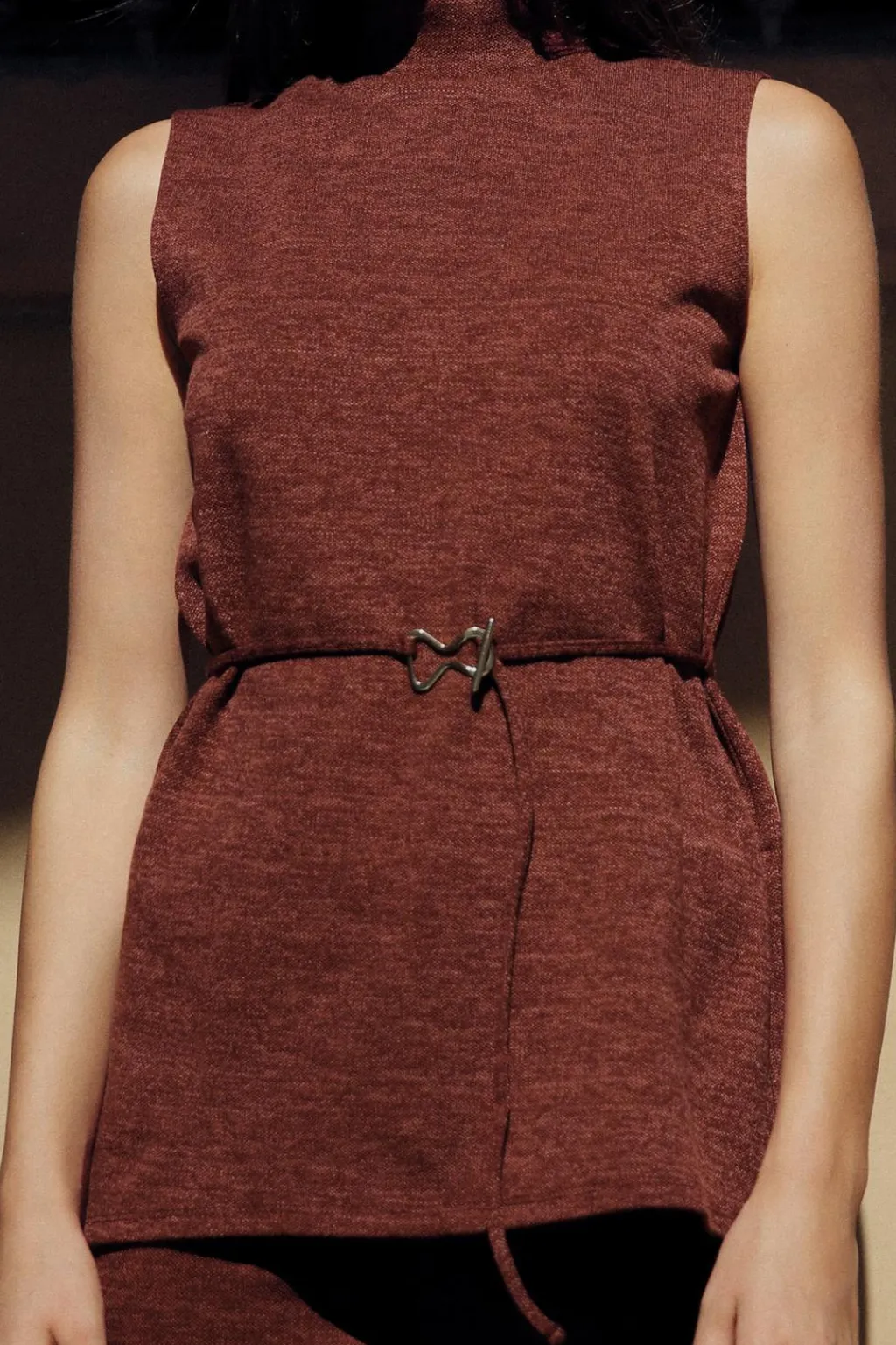 Top de cuello perkins y manga sisa. Detalle cinturón fino en mismo tejido con hebilla metálica.