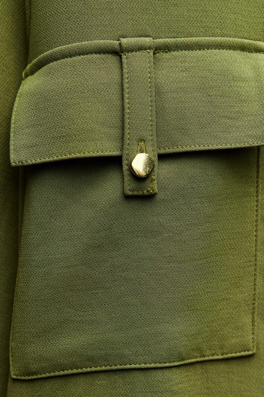 Vestido de cuello solapa y manga larga. Bolsillos delanteros de plastrón con solapa. Cierre frontal con botones dorados y cinturón.