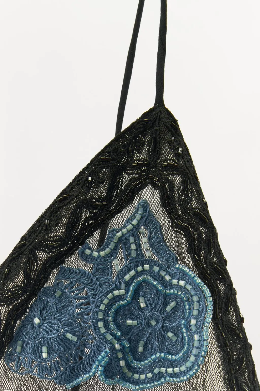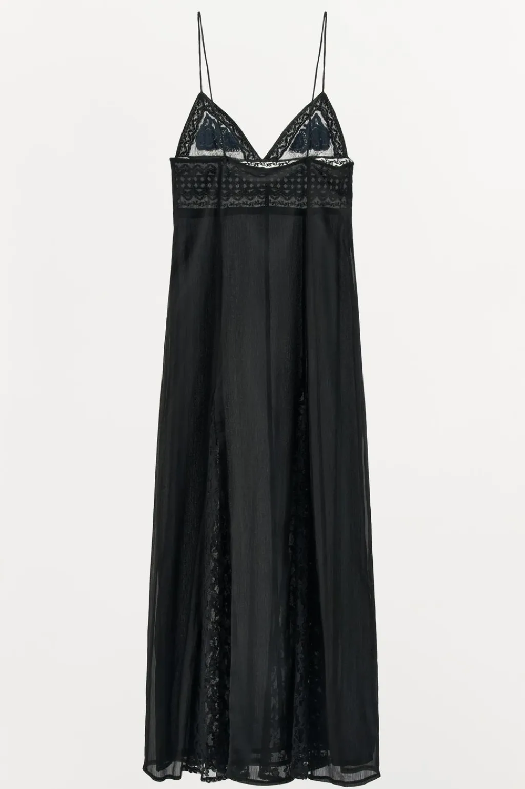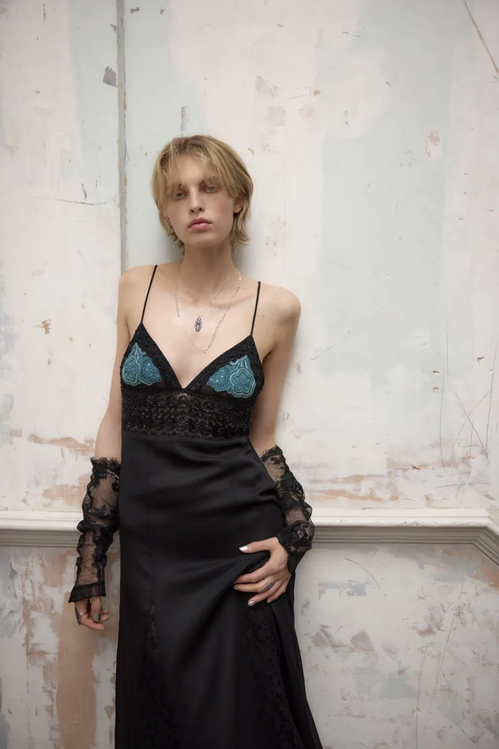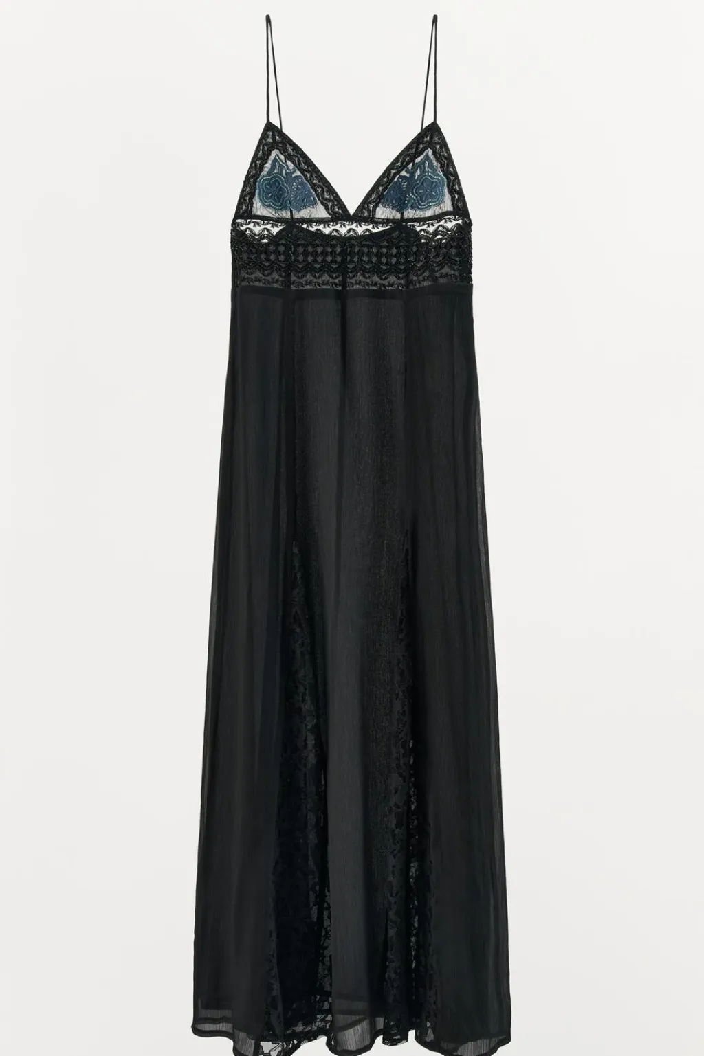 Vestido largo confeccionado en hilatura con mezcla de algodón. Escote pico y tirantes finos. Detalle combinación de tejidos y encaje a tono. Bordado floral en pecho a contraste y aplicación de abalorios. Forro interior. Cierre lateral con cremallera oculta en costura.