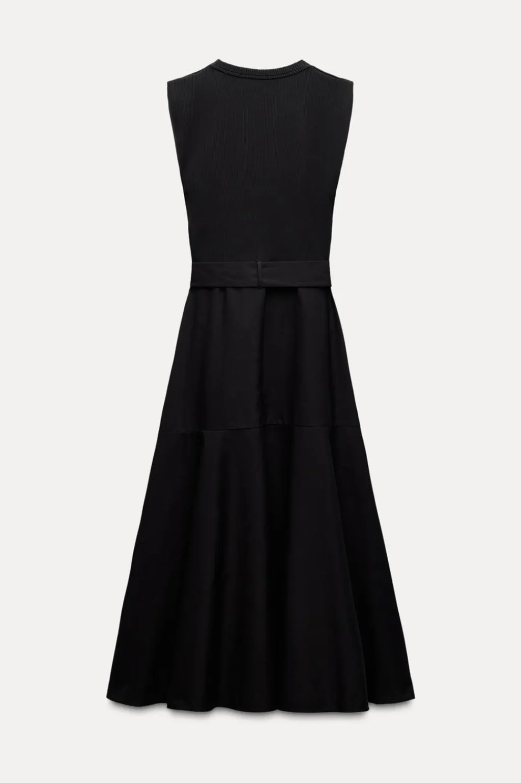 Vestido midi de cuello redondo y manga sisa. Cinturón ajustable con hebilla metálica. Detalle de combinación de tejidos a tono. Bajo acabado en línea evasé.