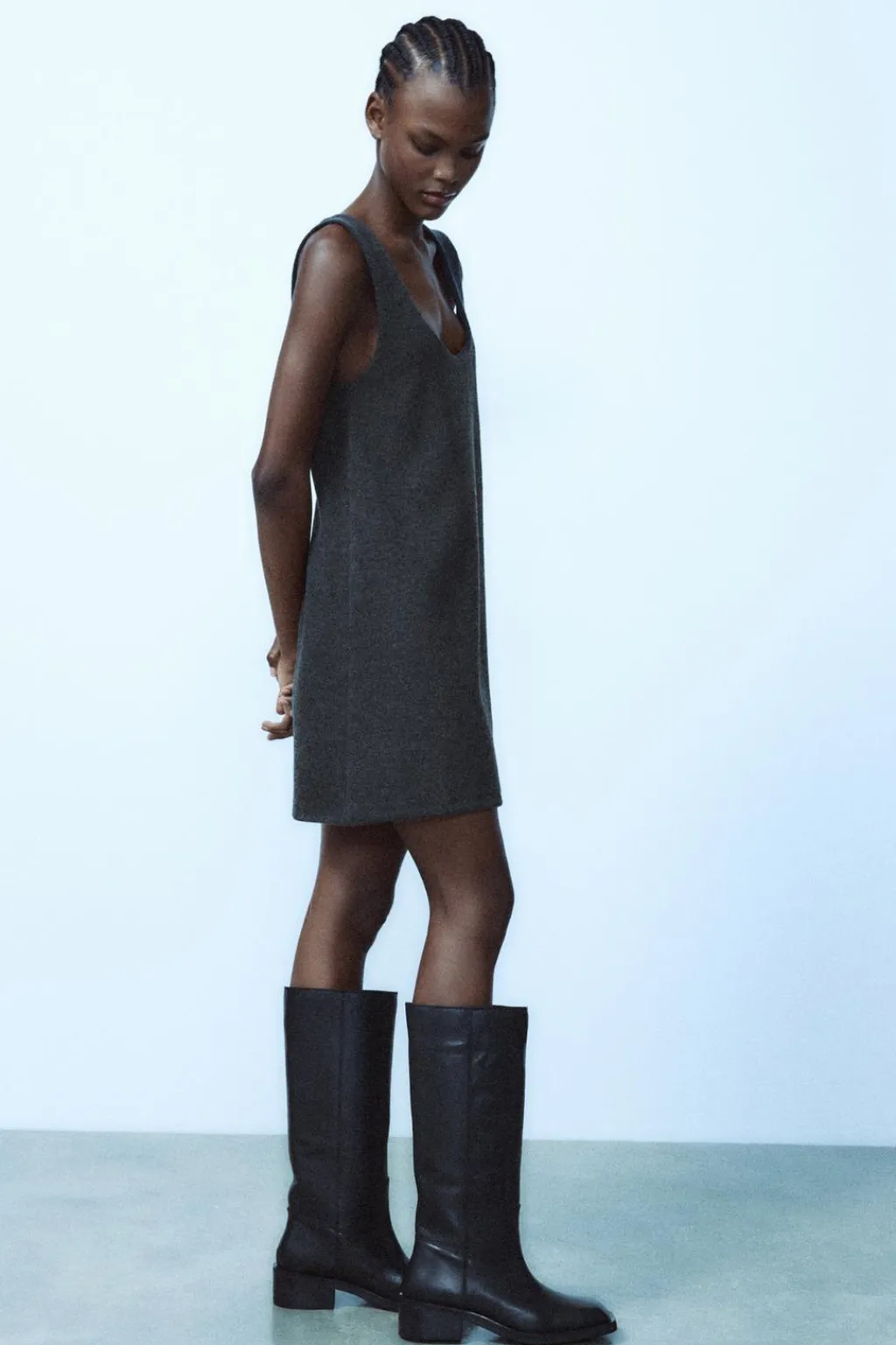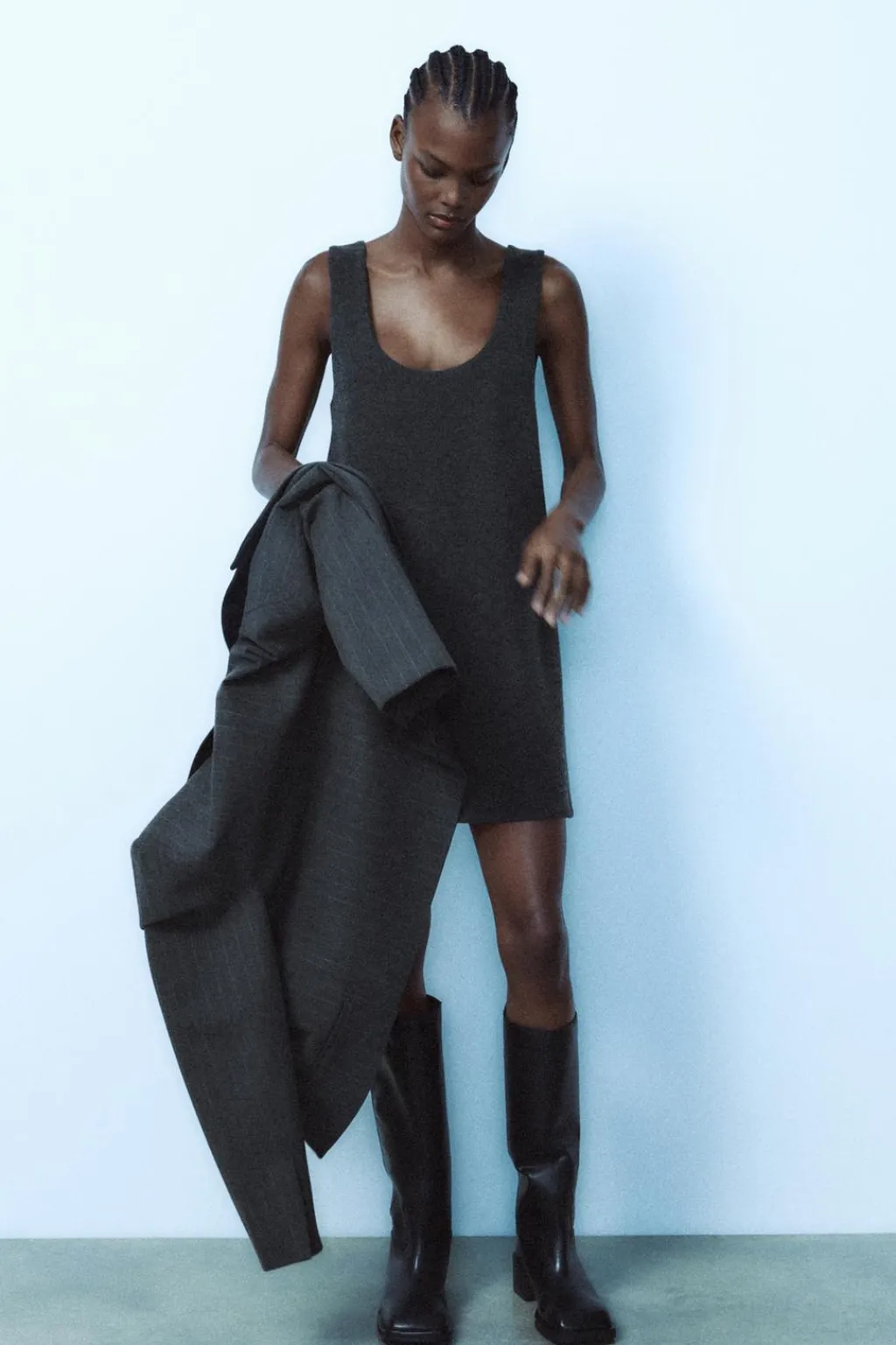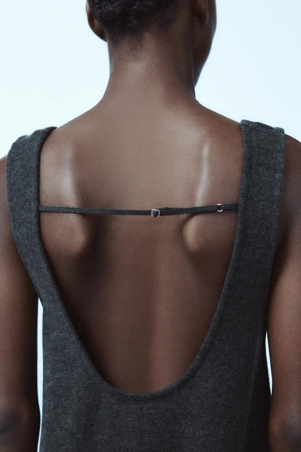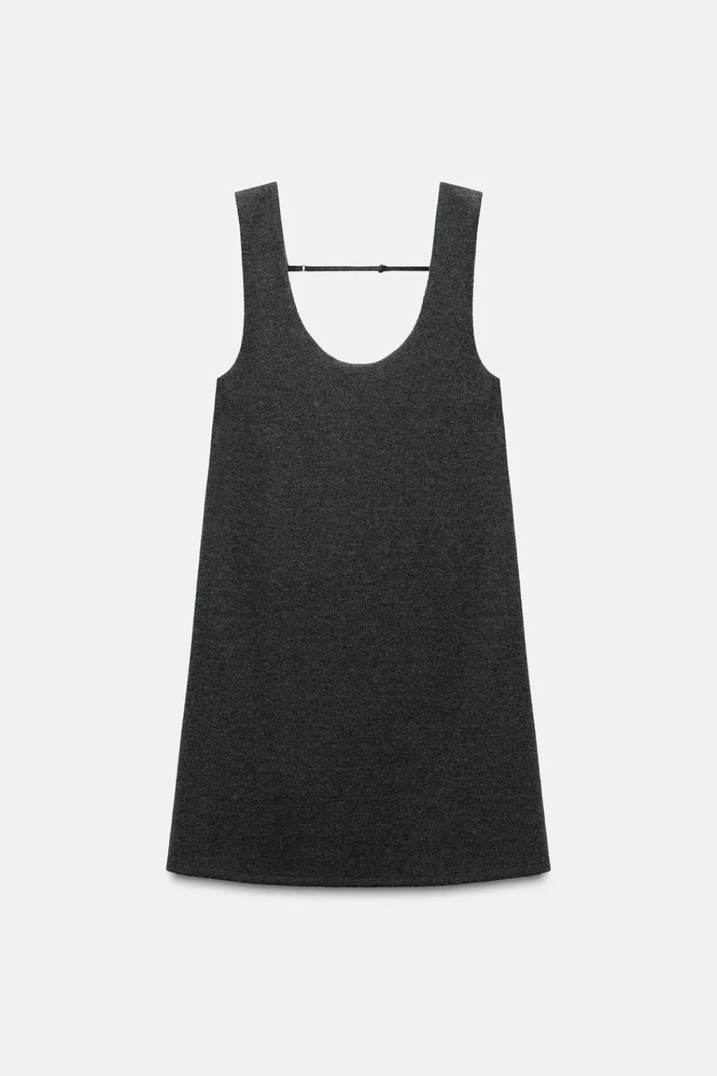 Vestido corto de escote redondo y tirante ancho. Detalle de tira ajustable en espalda. Tejido tacto soft.