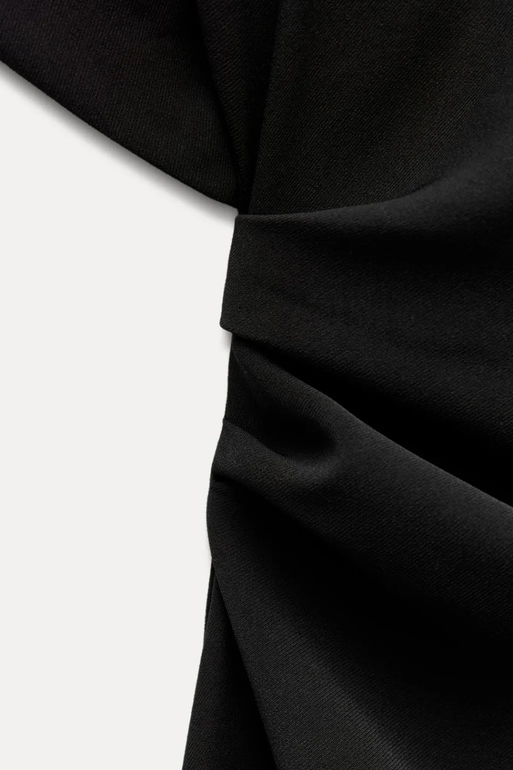 Vestido midi de cuello redondo y manga corta amplia. Detalle de tejido drapeado en cintura. Cierre en espalda con cremallera oculta en costura.