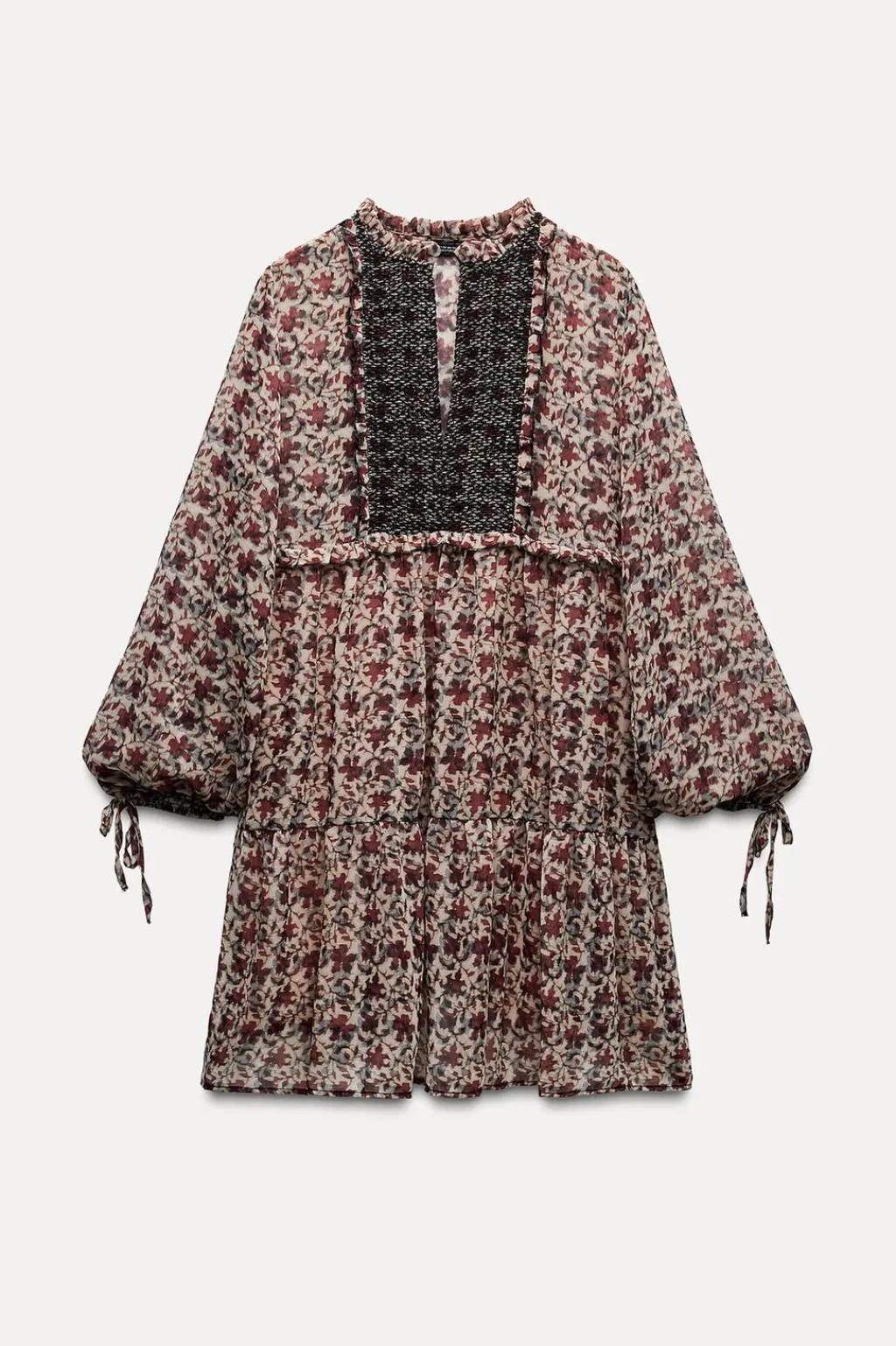 Vestido corto de cuello redondo con escote pico y manga larga acabada en elástico con cordón. Detalle de acabados con volantes y nido de abeja delantero. Forro interior.