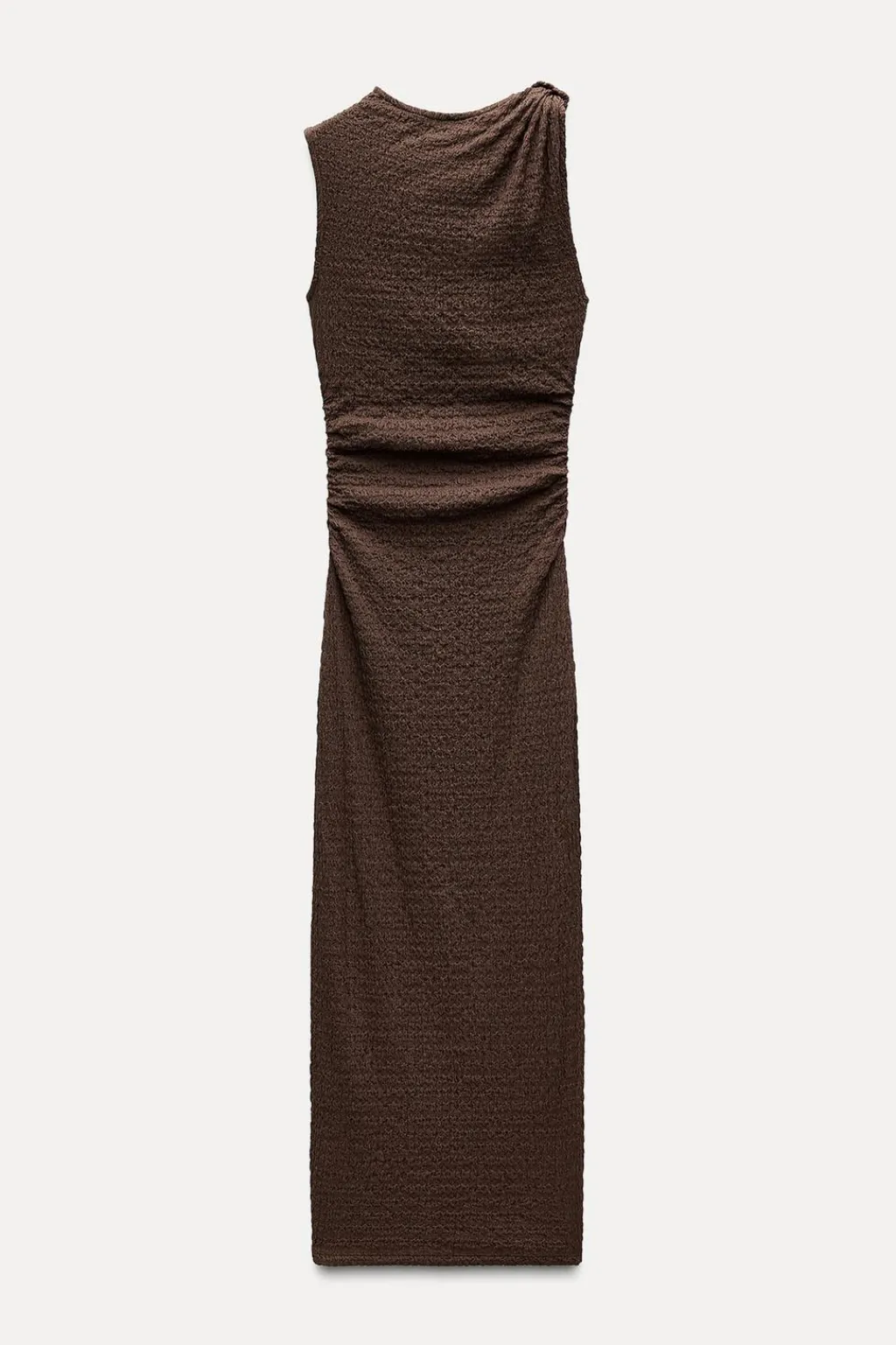 Vestido largo de cuello redondo y manga sisa. Detalle de nudo en hombro. Tejido drapeado en cintura.