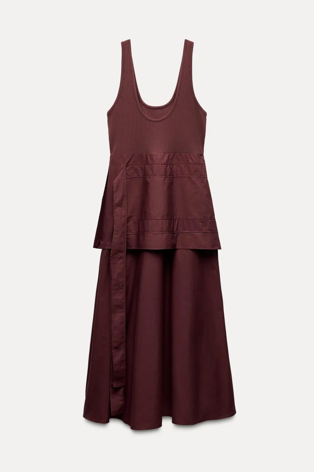 Vestido midi de escote redondo y tirantes anchos. Detalle de combinación de tejidos a tono y cinta en mismo tejido. Bajo acabado en volumen.