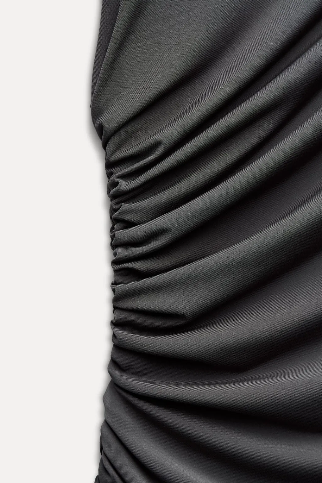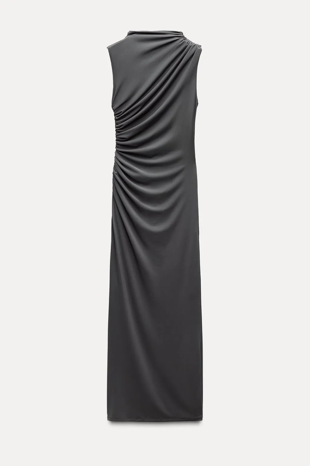 Vestido midi confeccionado en tejido tipo punto. Cuello subido y manga sisa. Tejido drapeado. Forro interior combinado. Cierre en espalda con cremallera oculta en costura.