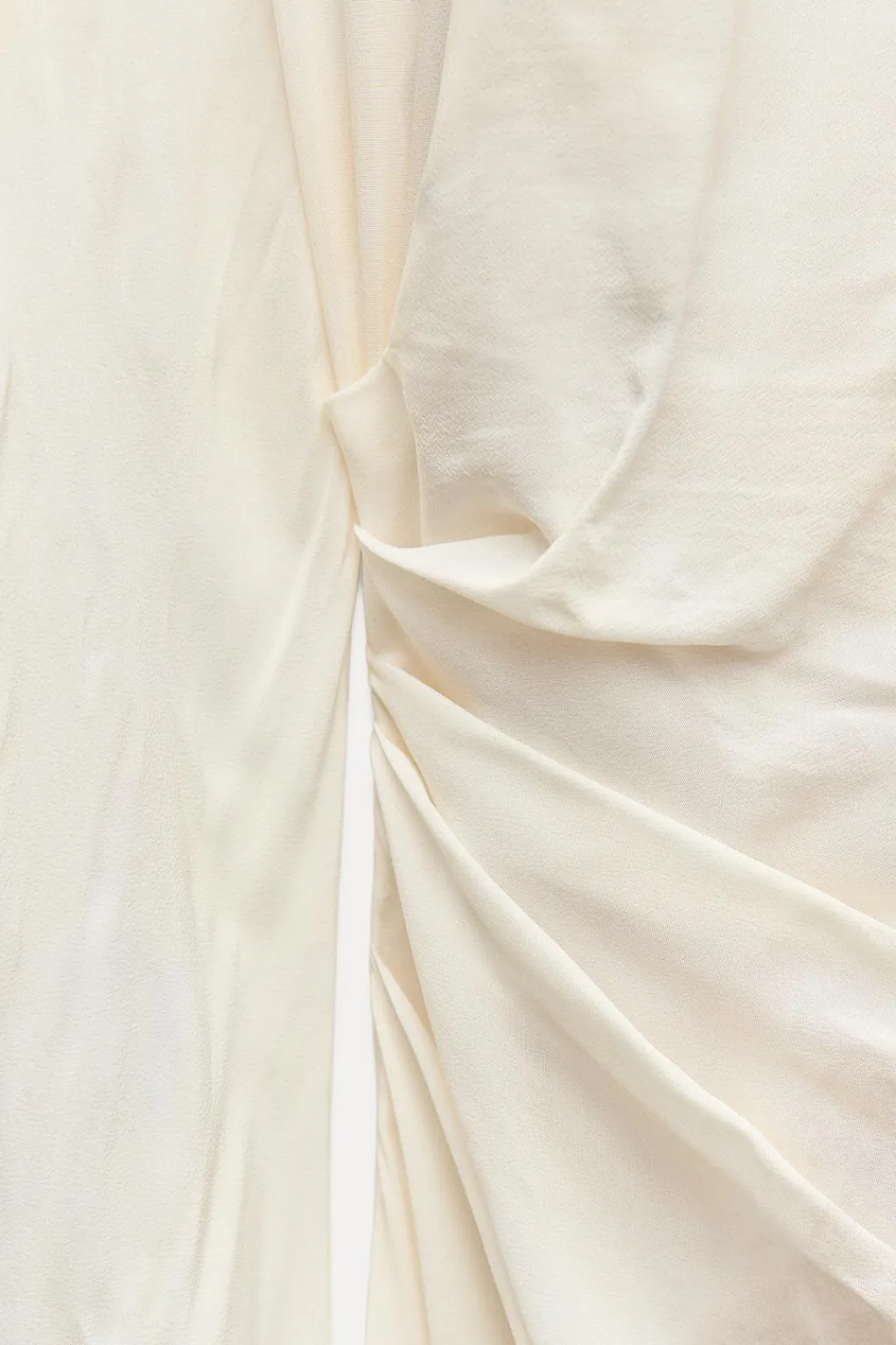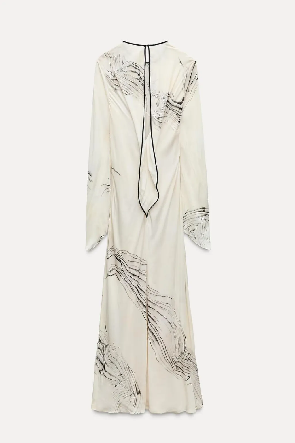 Vestido midi confeccionado en hilatura de viscosa 100%. Cuello redondo y manga larga acabada en línea evasé. Detalle de tejido drapeado y estampación a contraste. Cierre en espalda con abertura y botón.