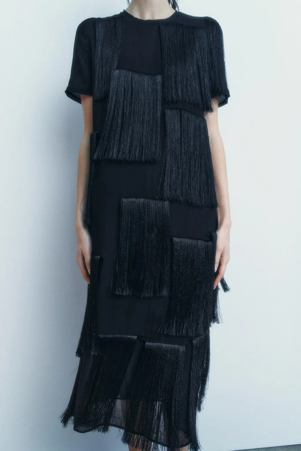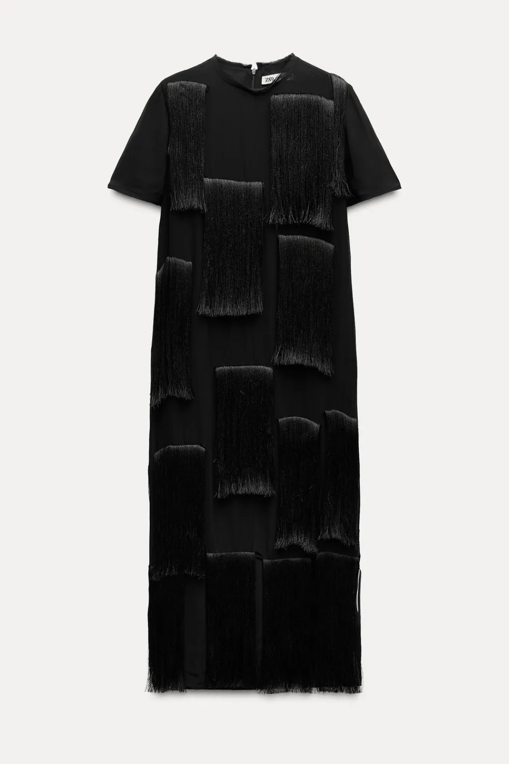 Vestido midi de cuello redondo y manga corta. Detalle de flecos a tono. Cierre en espalda con cremallera oculta en costura.