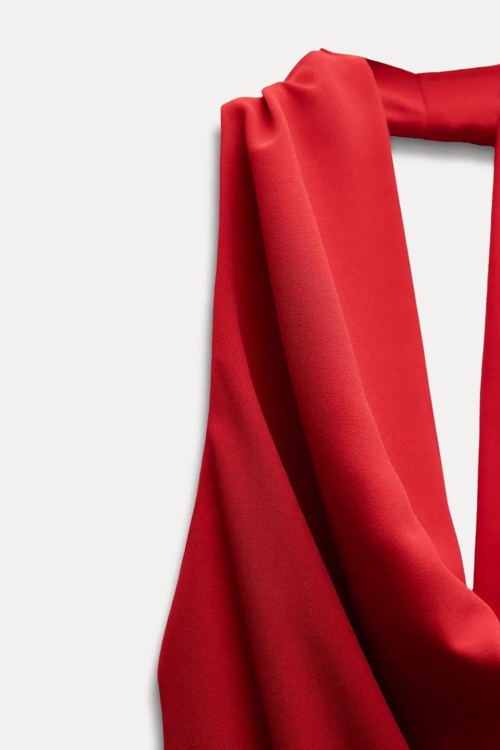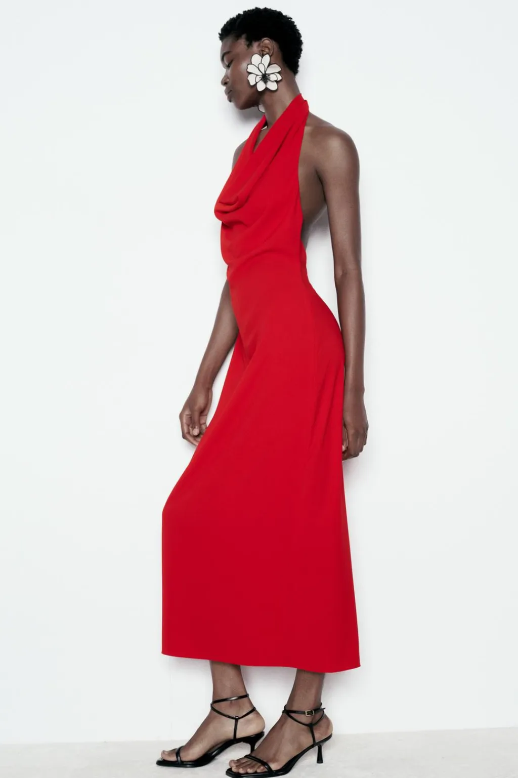 Vestido de cuello halter con escote fluido y espalda descubierta. Bajo con abertura trasera. Cierre con cremallera oculta en costura.