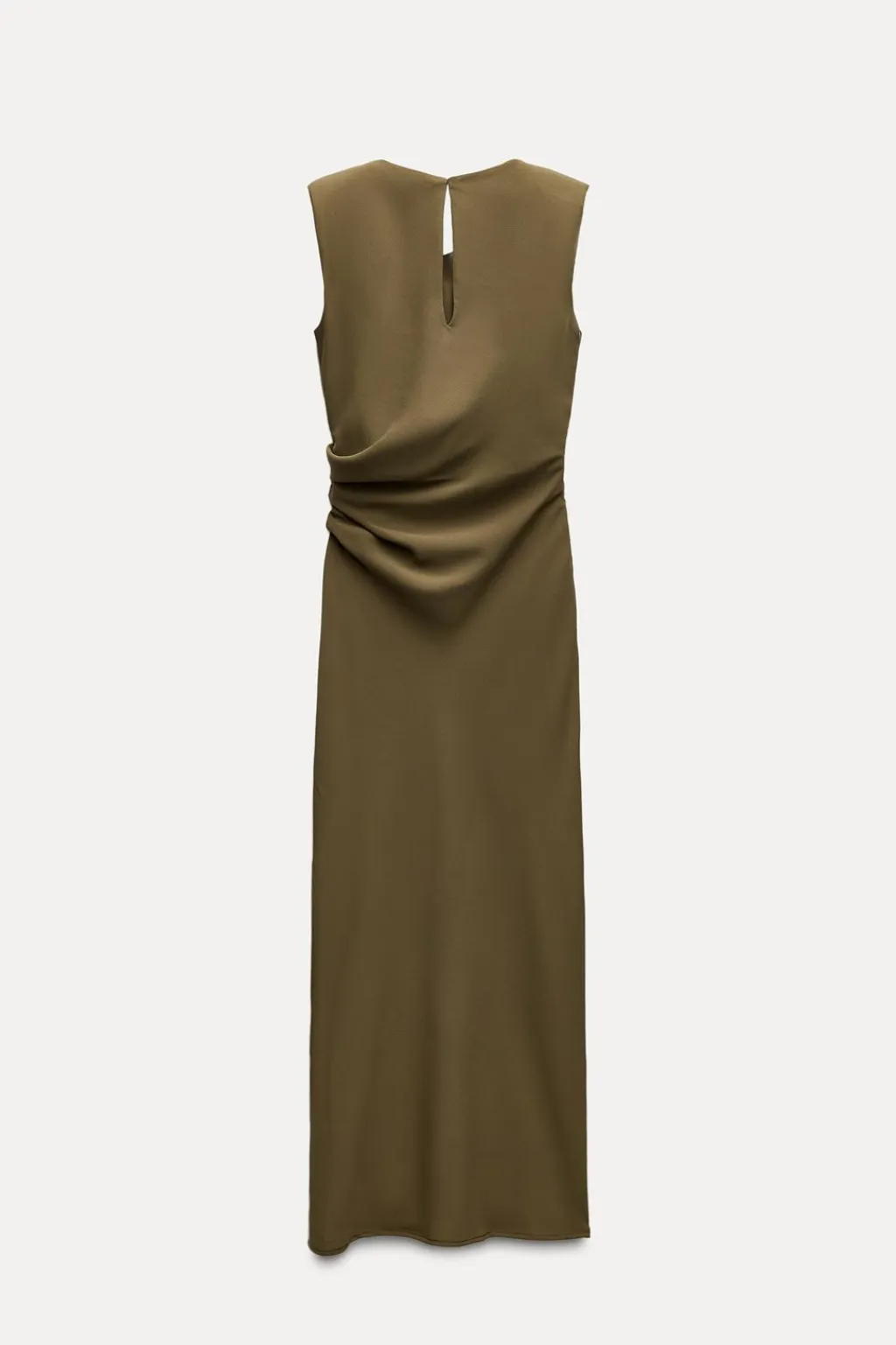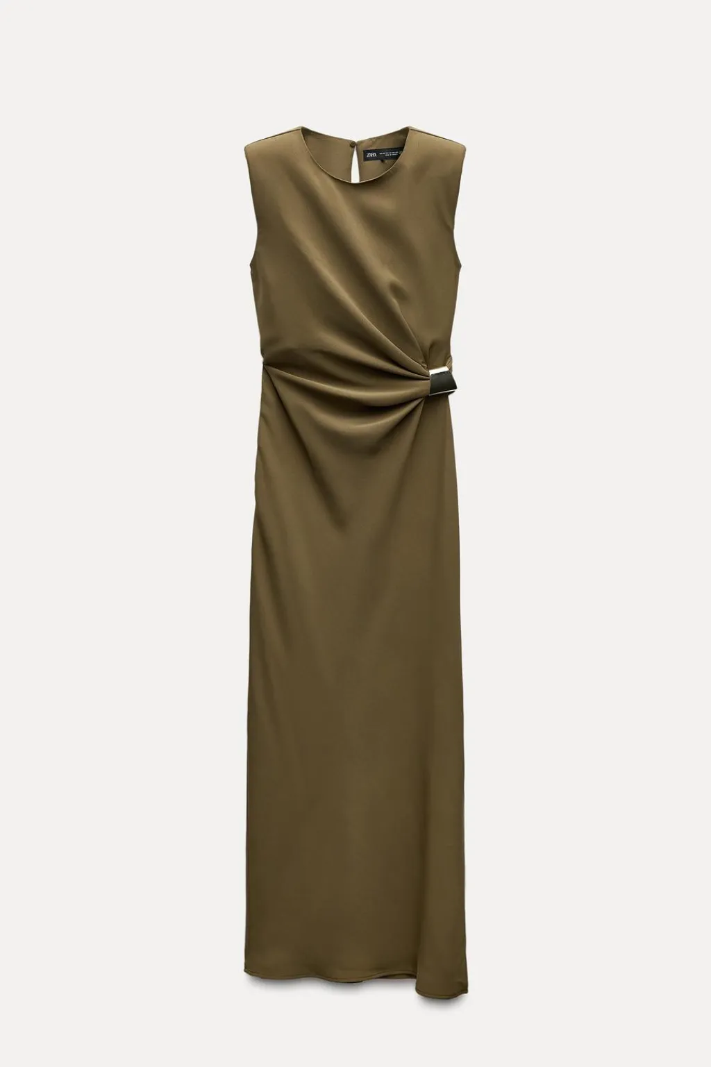 Vestido midi de cuello redondo y. manga sisa con hombreras. Tejido drapeado. Detalle de pieza metálica en lateral. Bajo con abertura lateral. Cierre en espalda con abertura y botón.