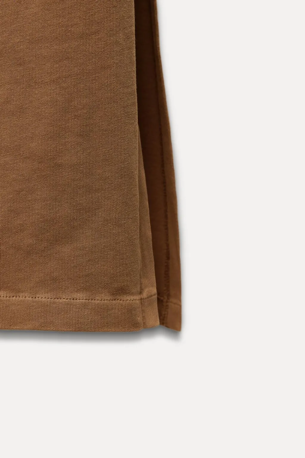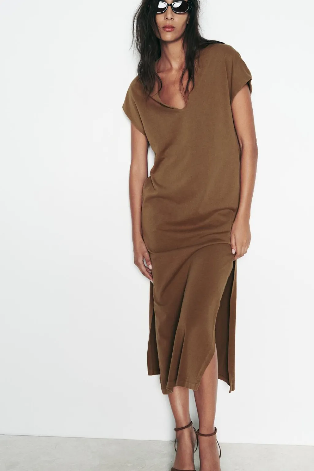 Vestido midi confeccionado en hilatura de algodón 100%. Escote pico y manga corta. Bajo con aberturas laterales.