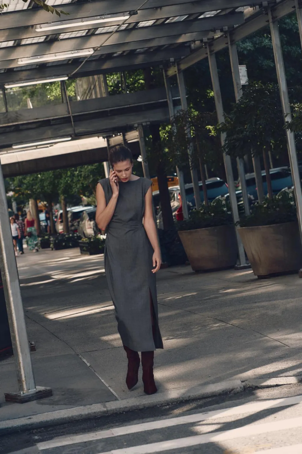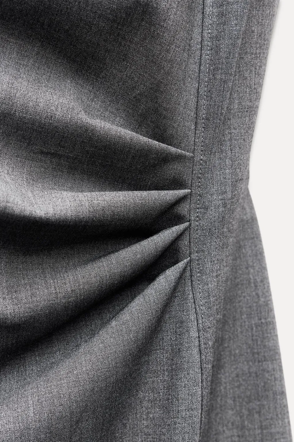 Vestido de cuello redondo y manga sisa con hombreras. Detalle de pliegues en cintura. Bajo con abertura lateral. Cierre en espalda con cremallera oculta en costura.