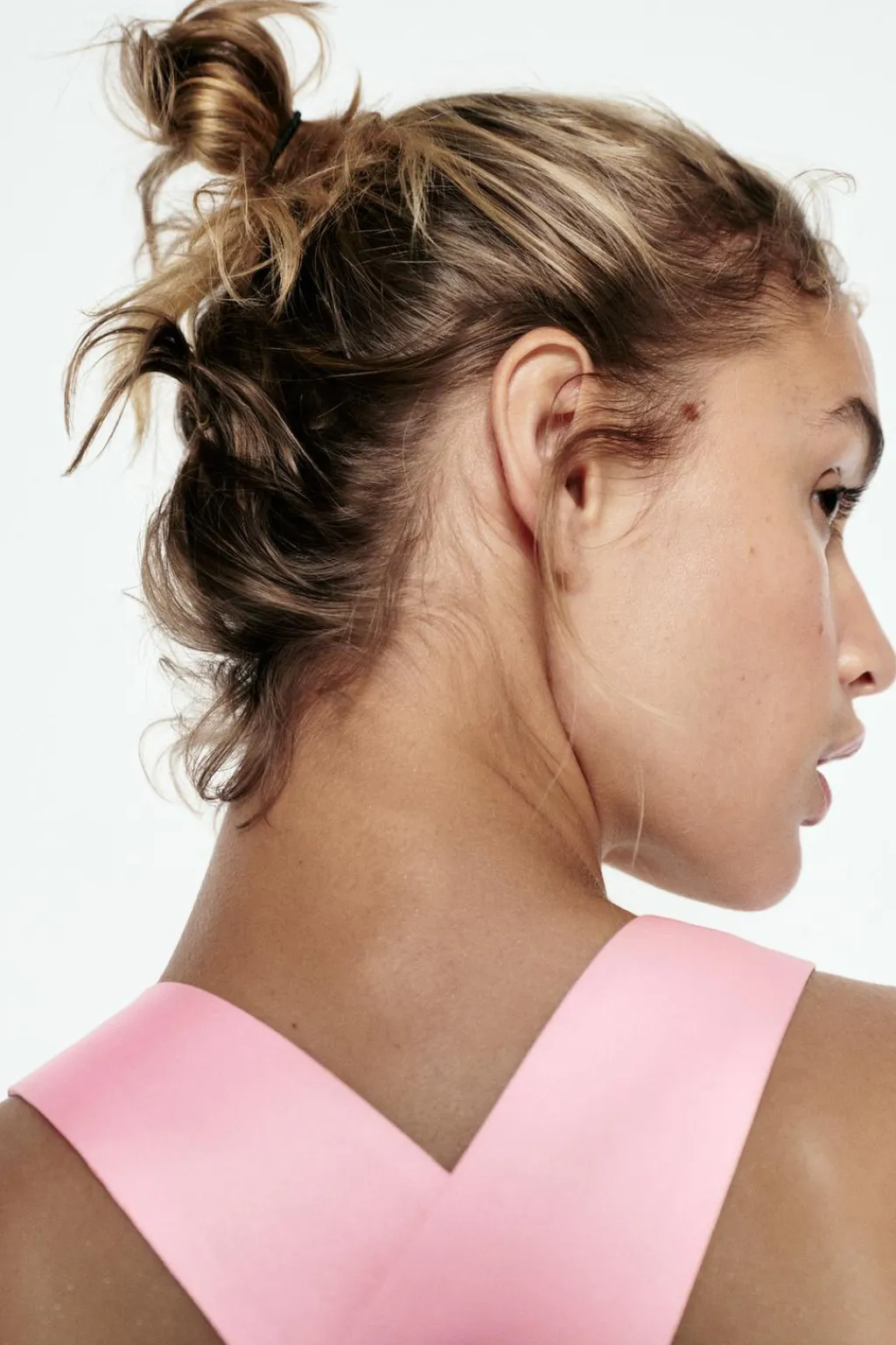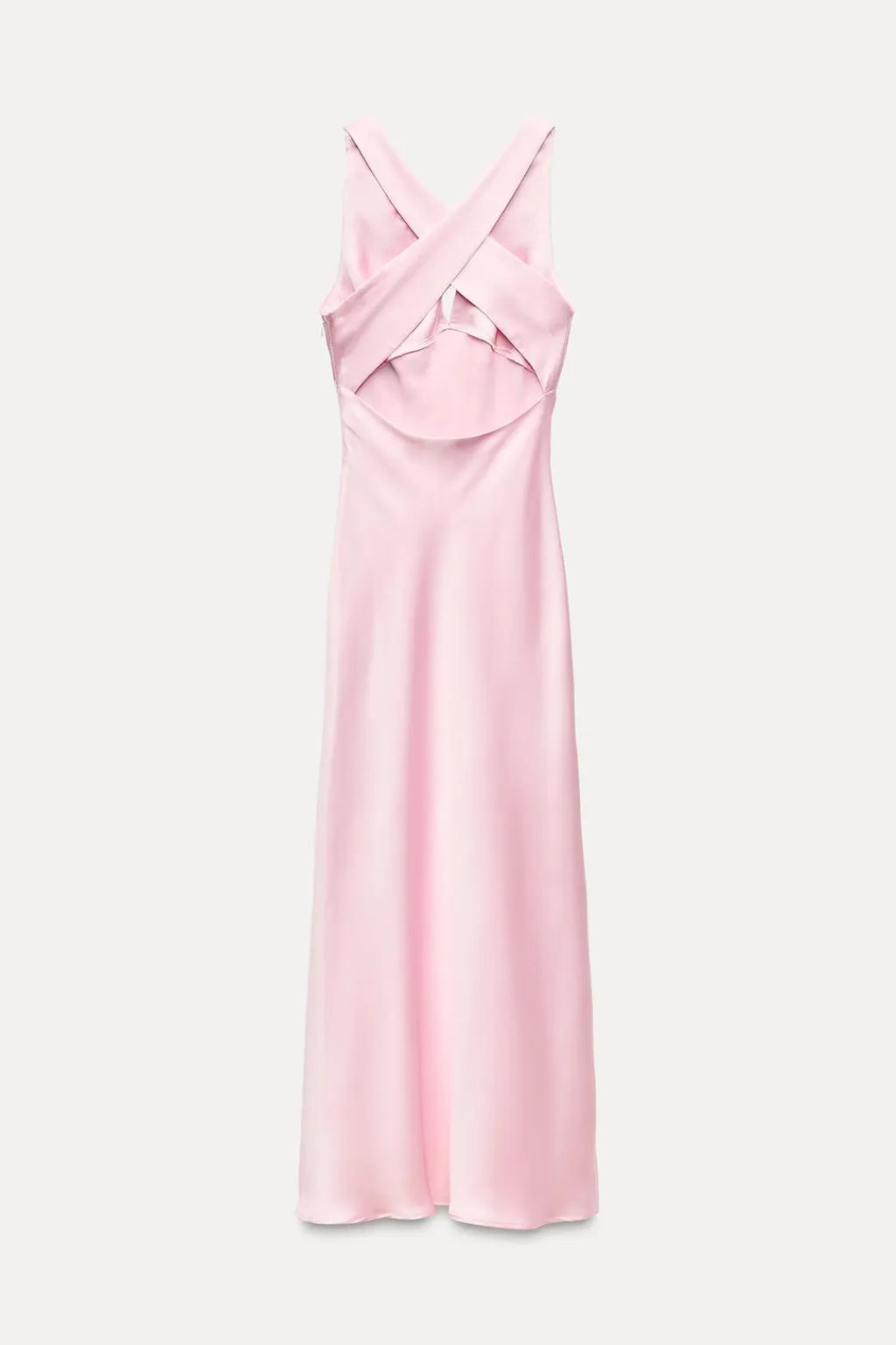Vestido de escote pico y tirantes anchos cruzados en espalda. Cintura entallada. Cierre lateral con cremallera oculta en costura.