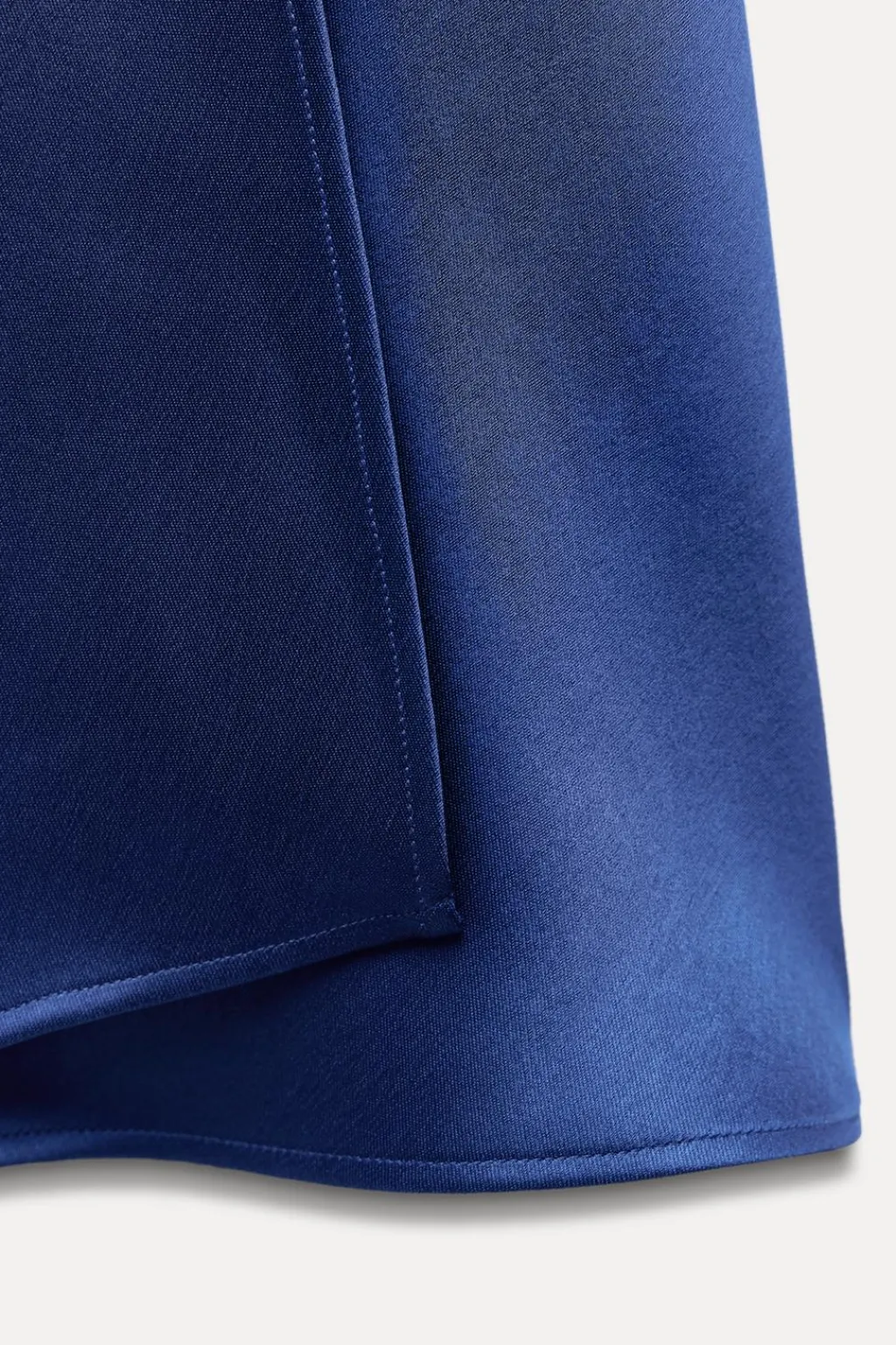 Vestido midi satinado de cuello redondo y manga corta. Cinturón en mismo tejido ajustable con lazadas. Bajo acabado con abertura en delantero. Cierre en espalda con cremallera oculta en costura.