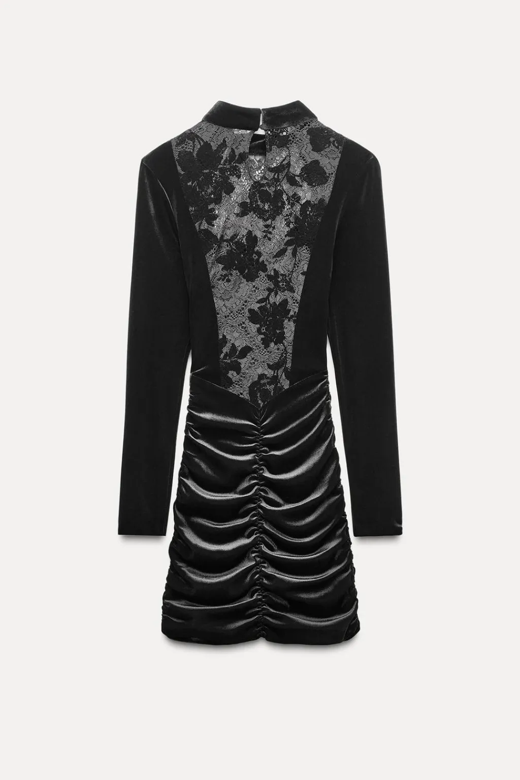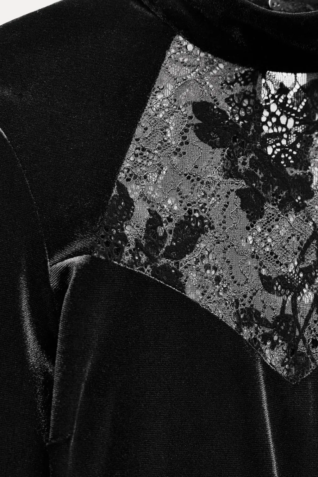 Vestido de terciopelo con cuello subido y manga larga. Detalle de tejido combinado con encaje. Bajo acabado con frunces. Cierre lateral con cremallera oculta en costura y en espalda con botones.
