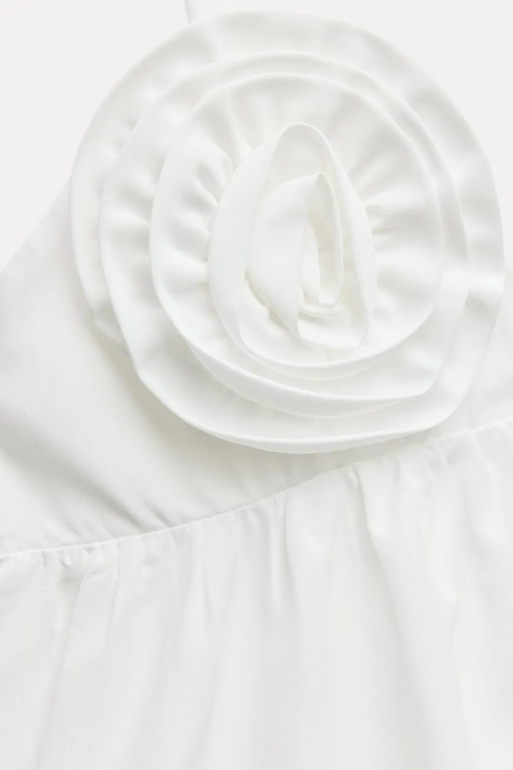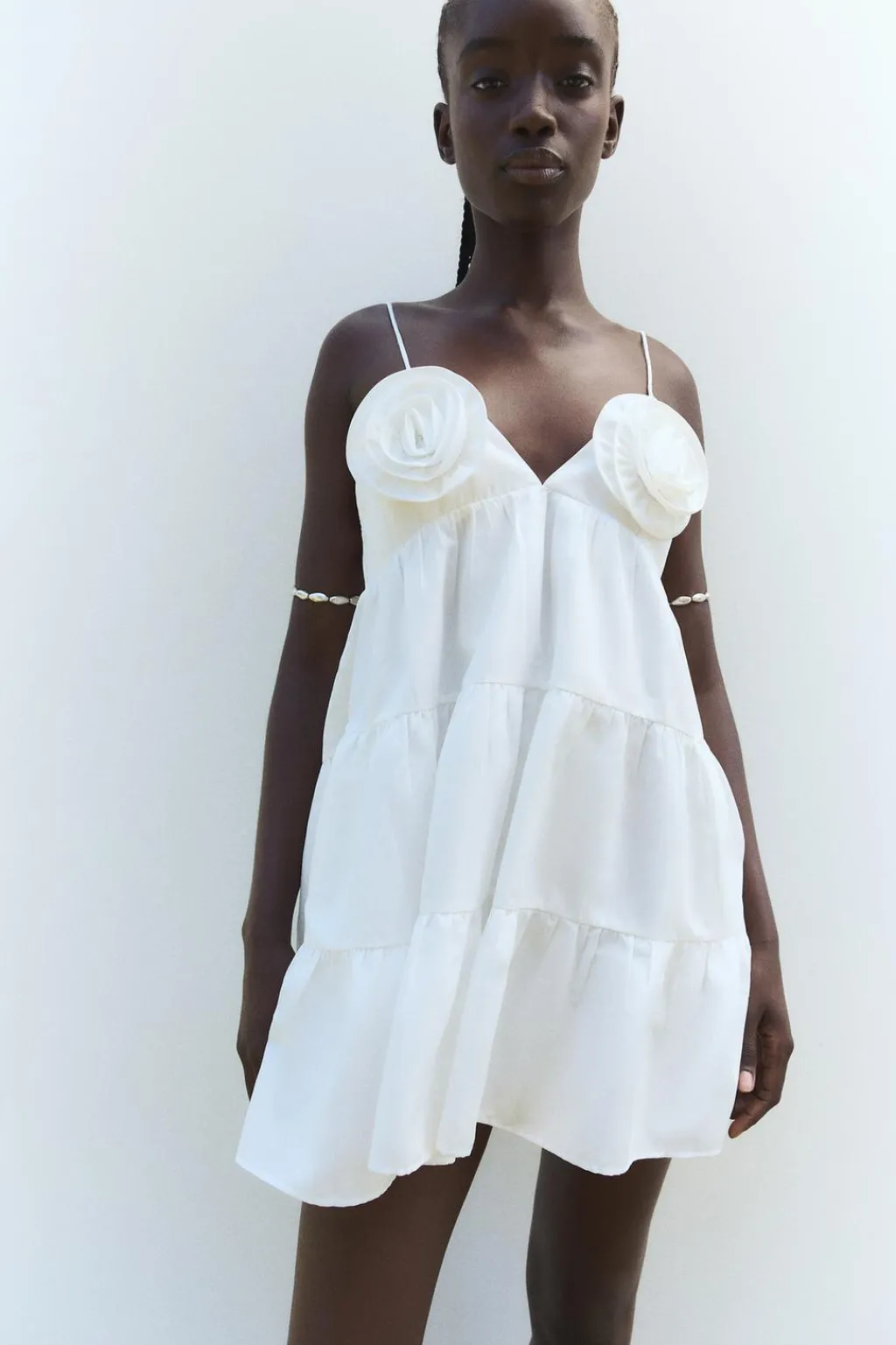 Vestido corto de escote pico y tirantes finos. Bolsillos laterales ocultos en costura. Detalle de flores en relieve en pecho. Tejido elástico tipo nido de abeja en espalda. Forro interior combinado a tono.