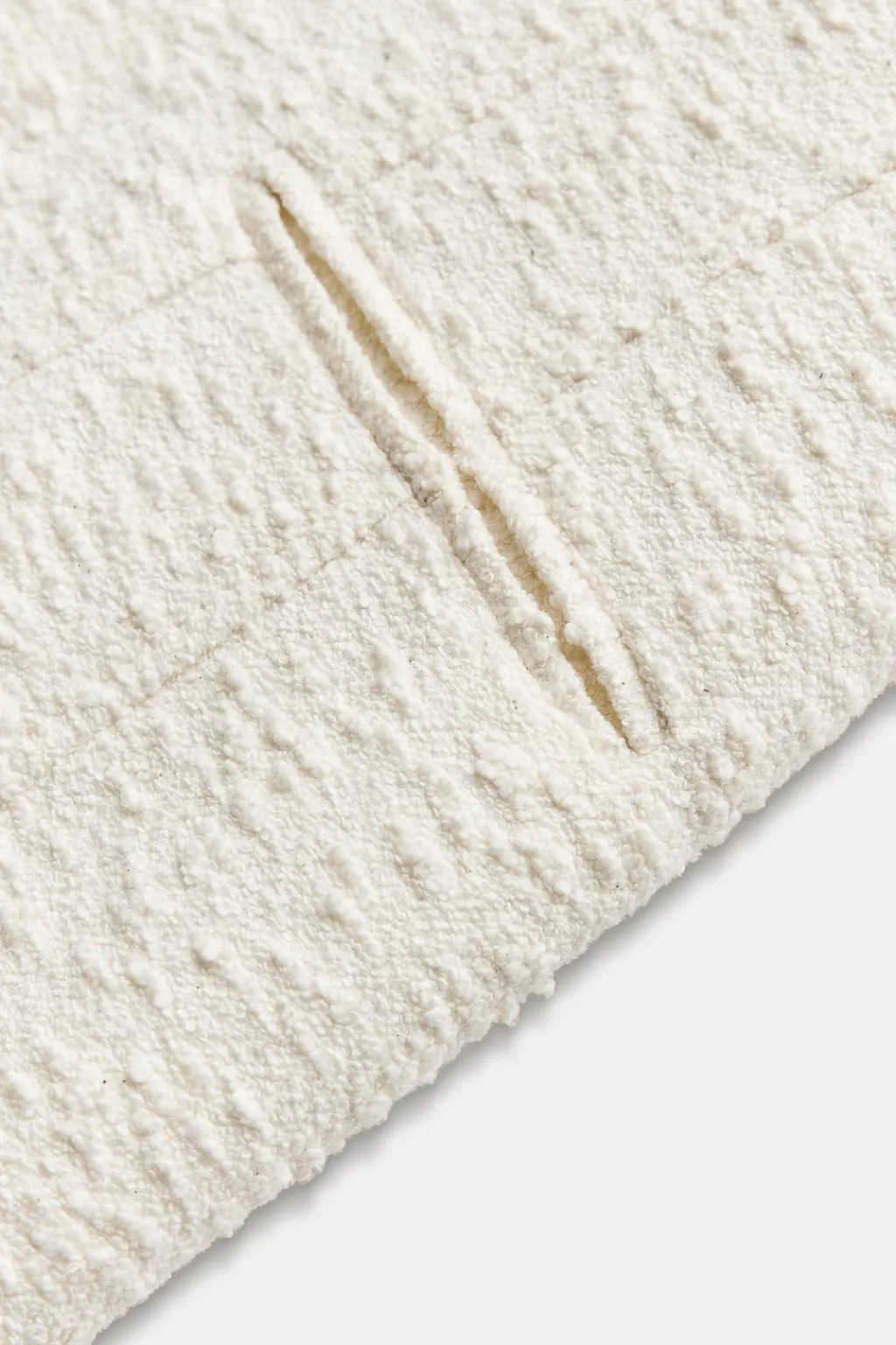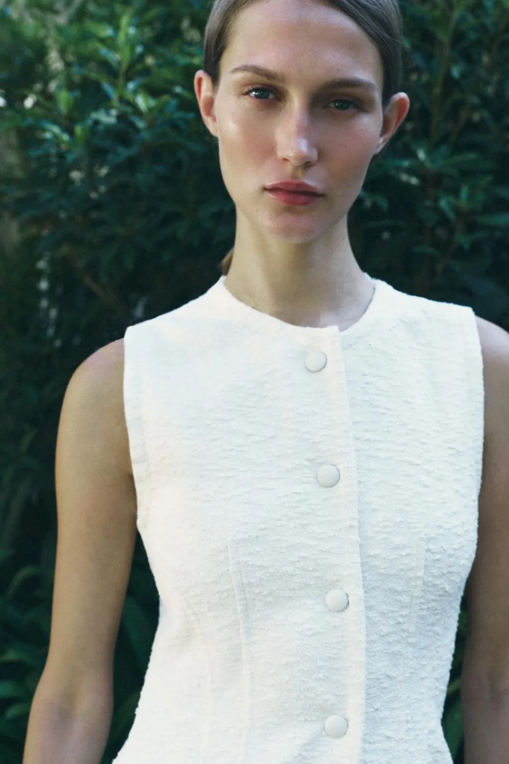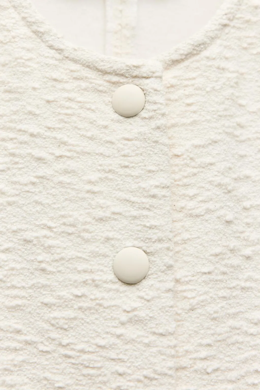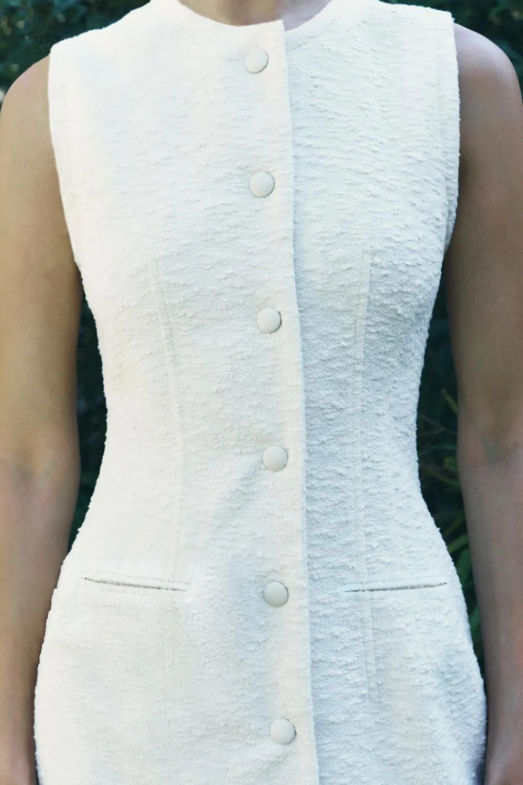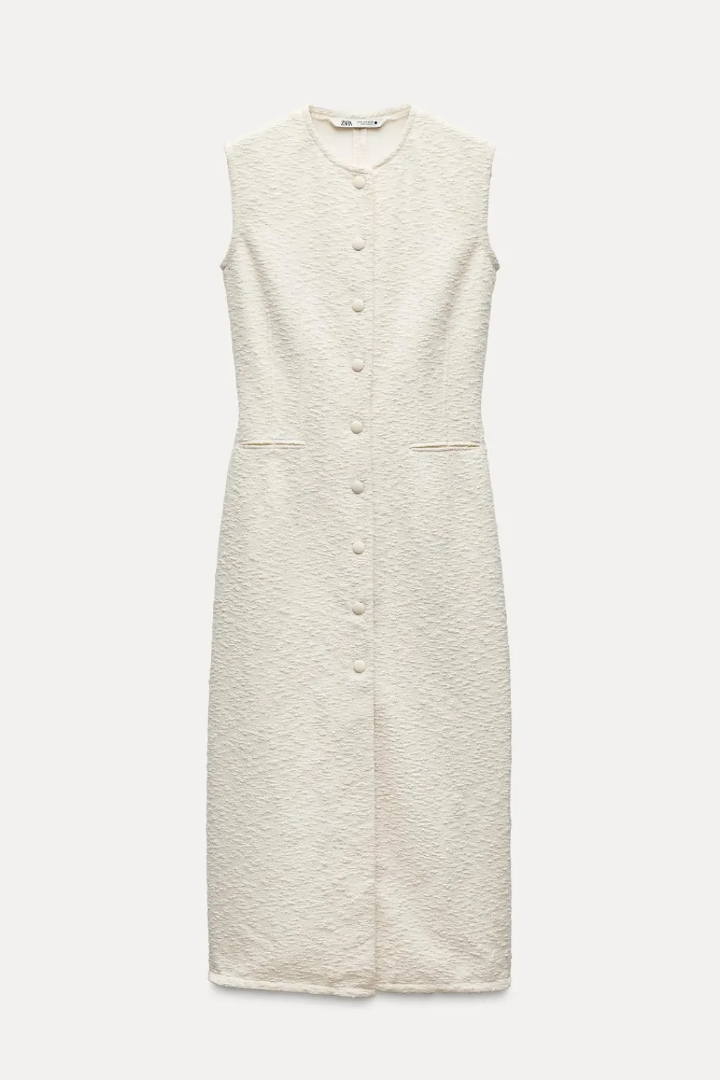 Vestido recto de cuello redondo y manga sisa. Bolsillos de vivo en delantero. Detalle de tejido con estructura. Acabados desflecados. Cierre frontal con botones forrados.