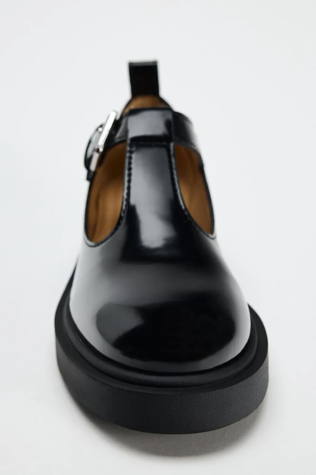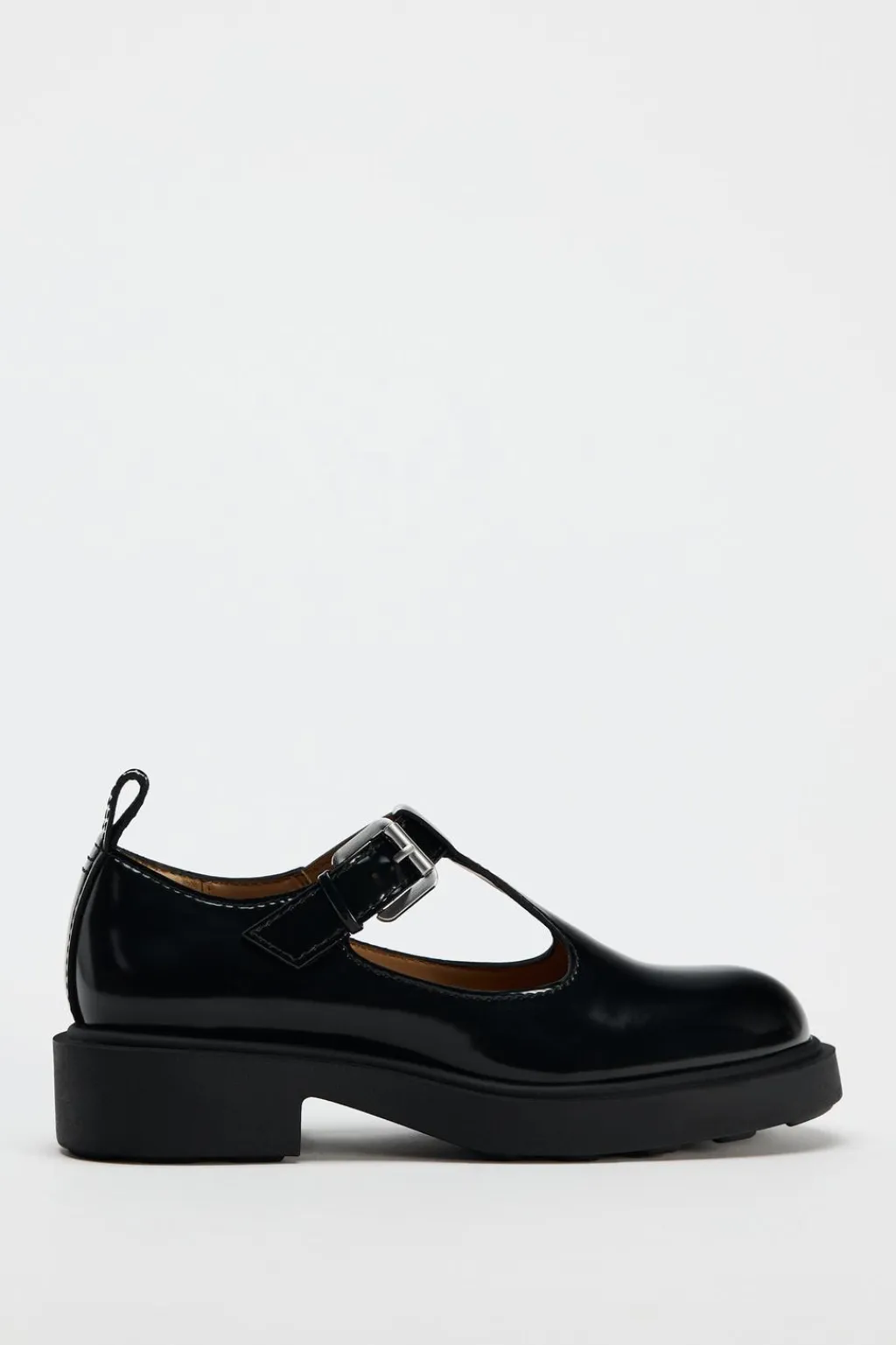 Zapato plano con detalle de tira en la parte delantera. Cierre mediante hebilla en la pulsera del tobillo. Detalle de tirador trasero.