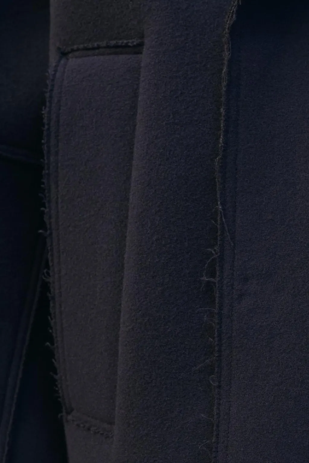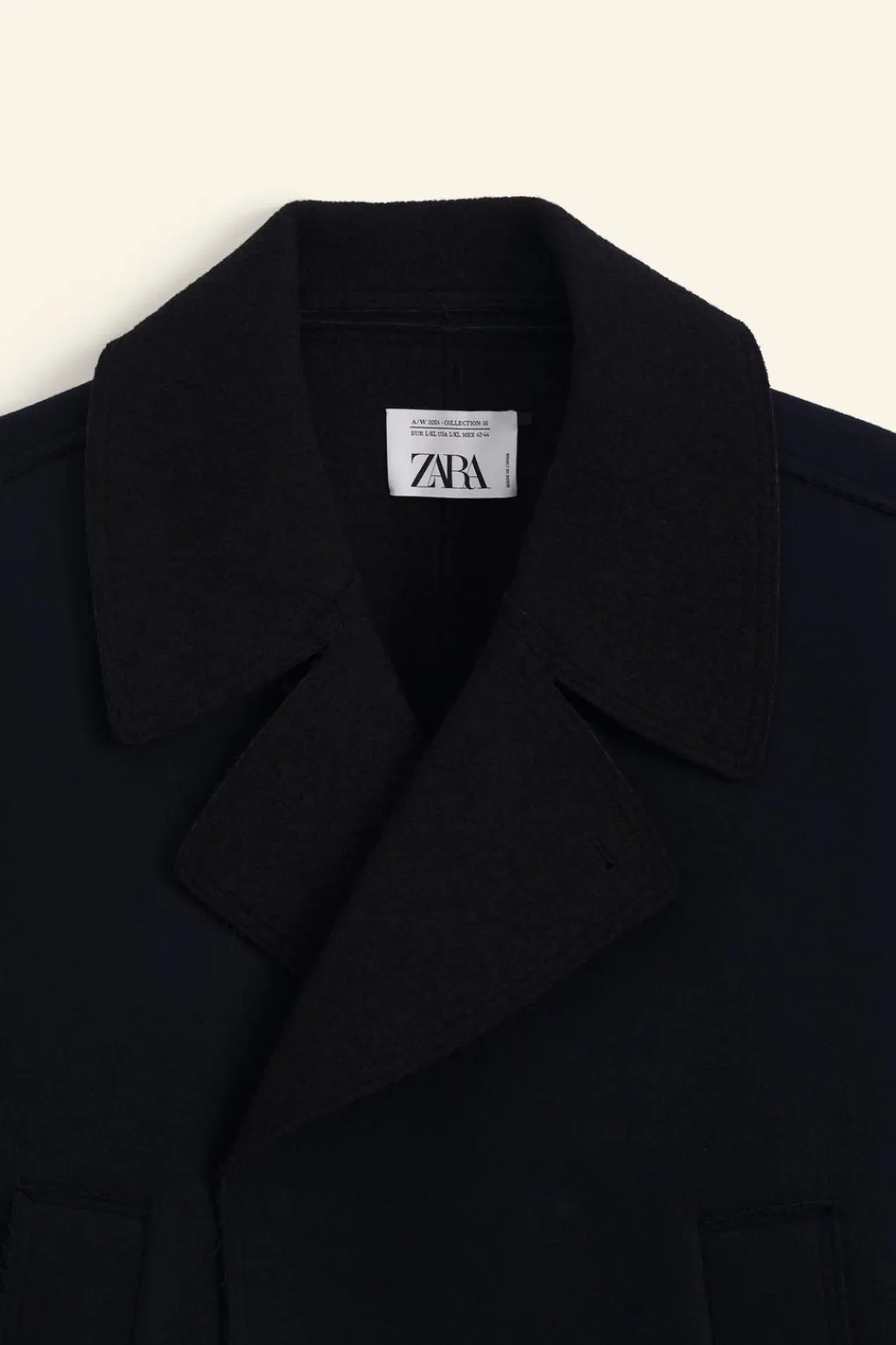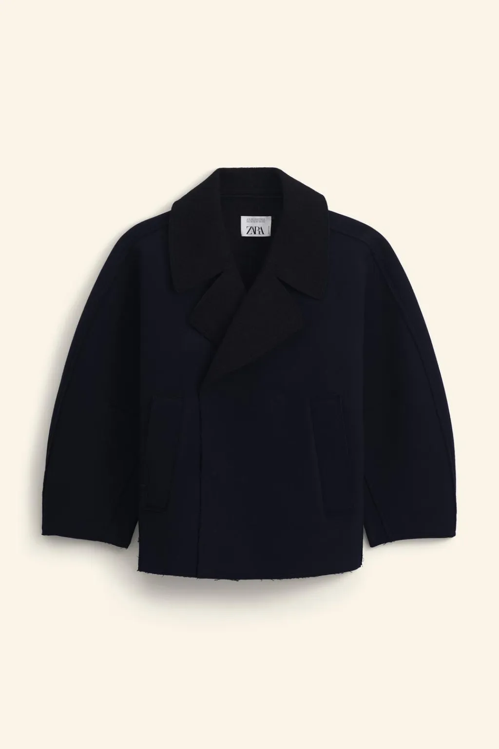 Abrigo relaxed fitconfeccionado en tejido con mezcla de lana. Cuello con solapas de muesca y manga larga ancha. Bolsillos de vivo en cadera y detalle de bolsillo interior. Acabados irregulares. Cierre frontal de botonadura cruzada oculta.