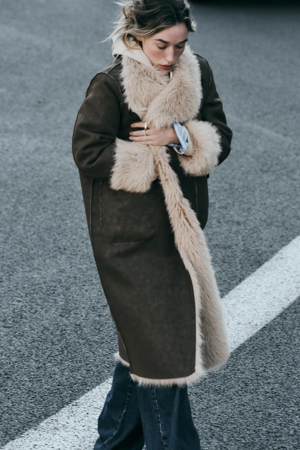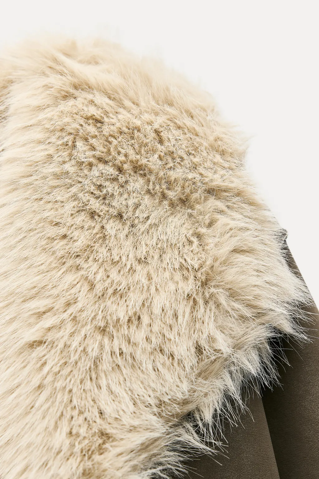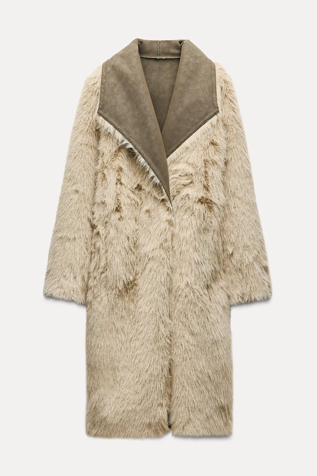 Abrigo de cuello solapa y manga larga. Bolsillos delanteros. Detalle de tejido interior combinado efecto pelo. Cierre frontal cruzado con un botón.