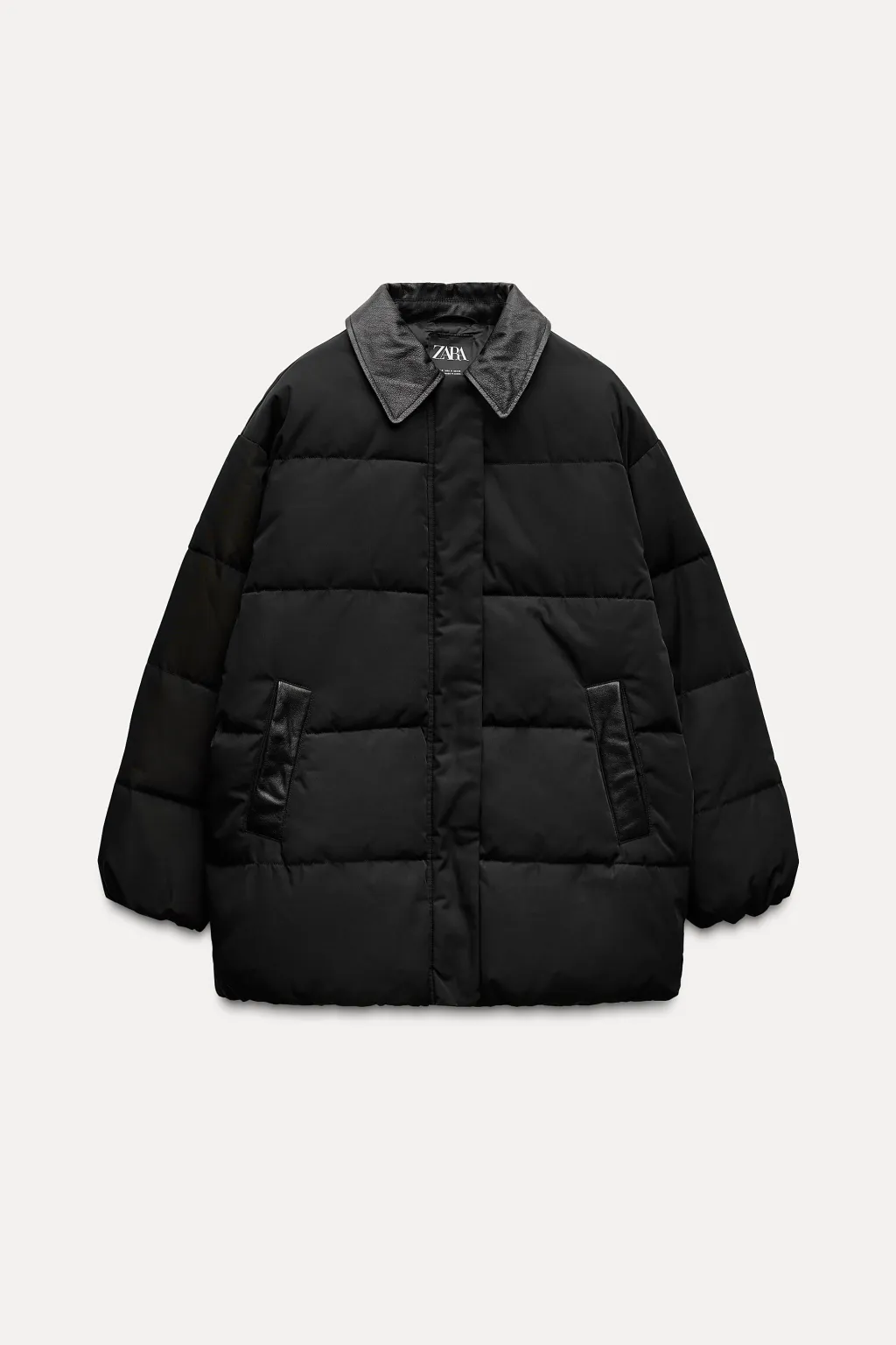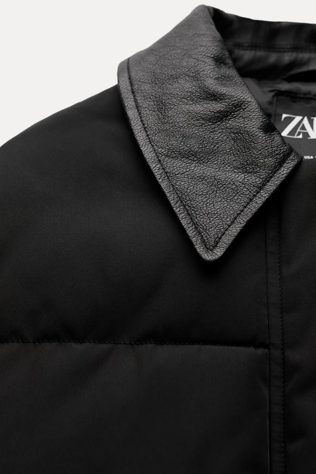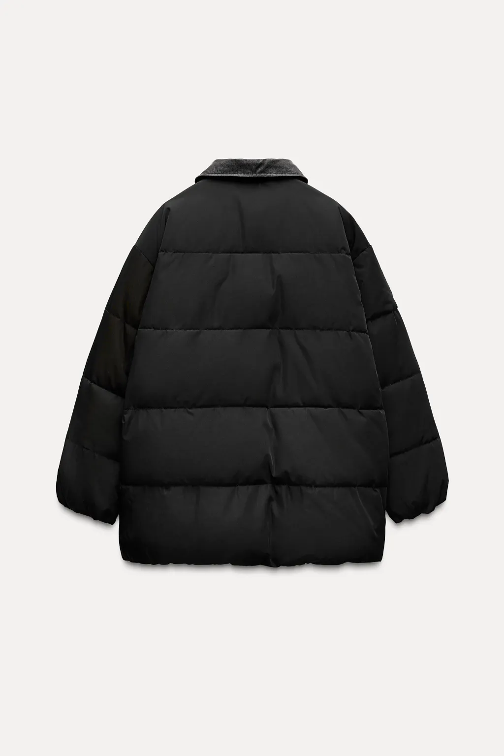 Anorak con cuello solapa y manga larga. Bolsillos en delantero. Detalle de aplicación de tejido en piel a tono. Cierre frontal con cremallera y botones a presión ocultos por solapa.