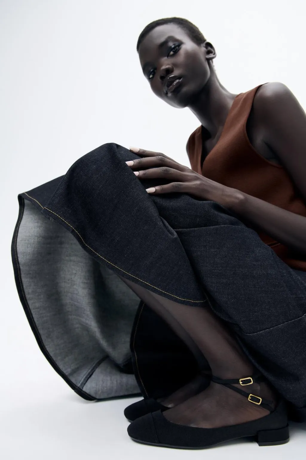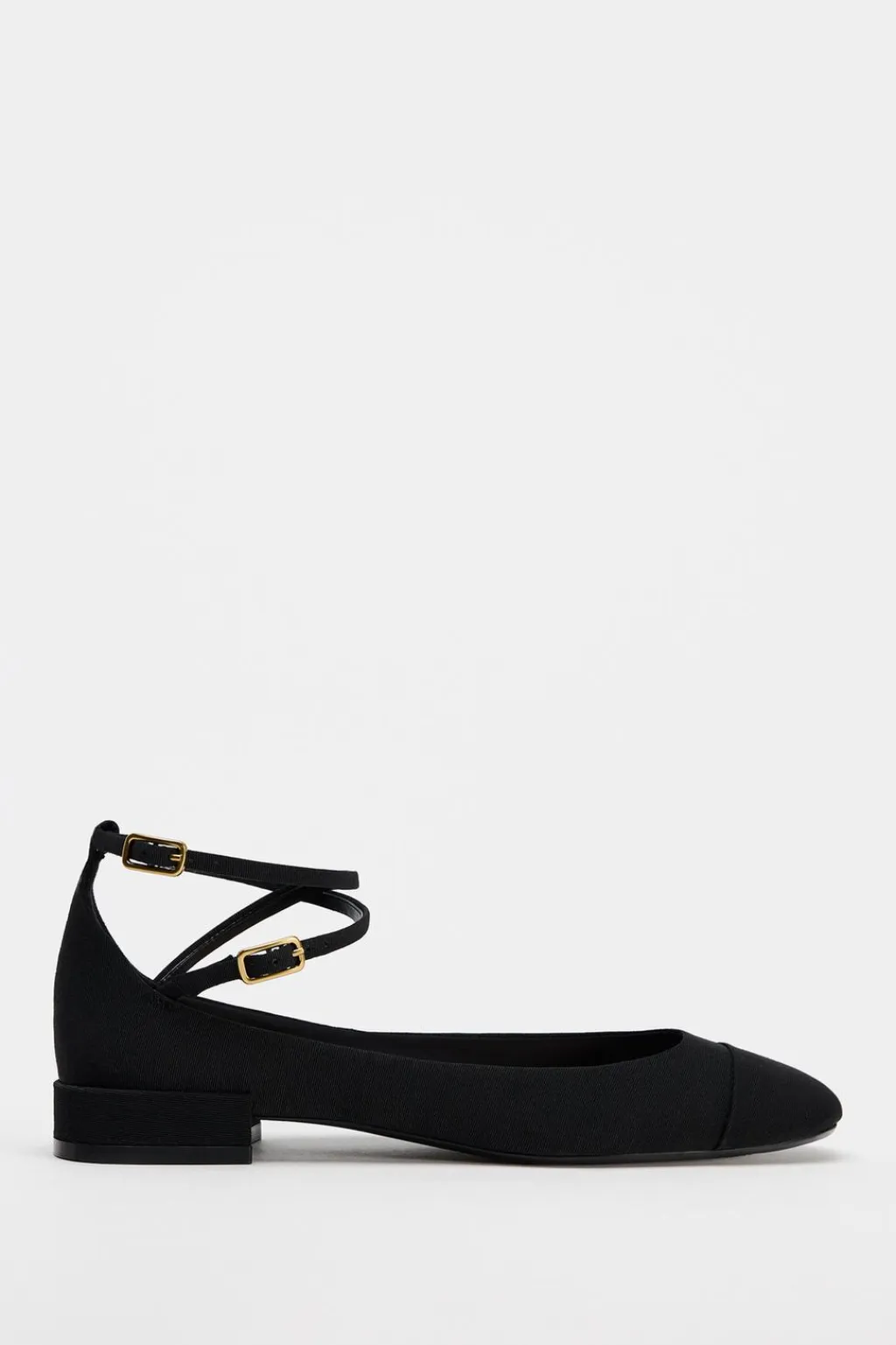 Zapato plano tipo bailarina en tejido. Cierre mediante doble tira con hebilla en la pulsera al tobillo.