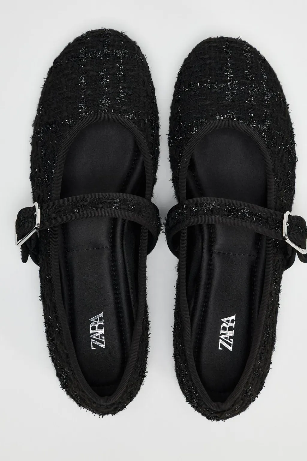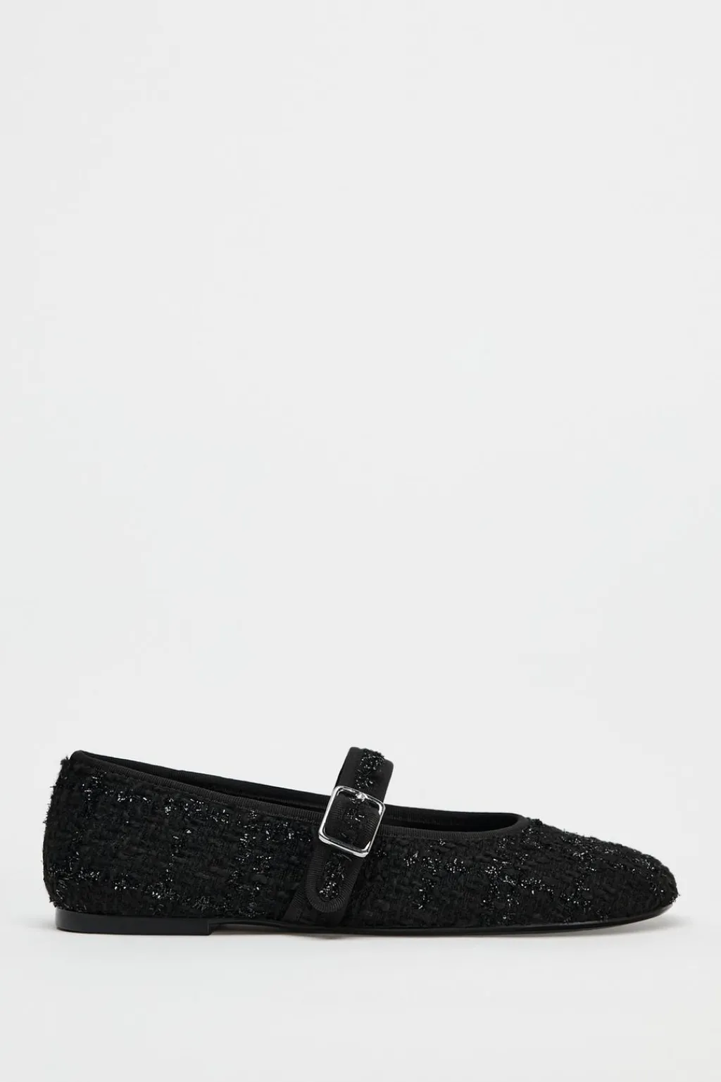 Zapato plano tipo bailarina en tejido con detalles en brillo. Tira con hebilla en la parte delantera. Acabada en punta redonda.