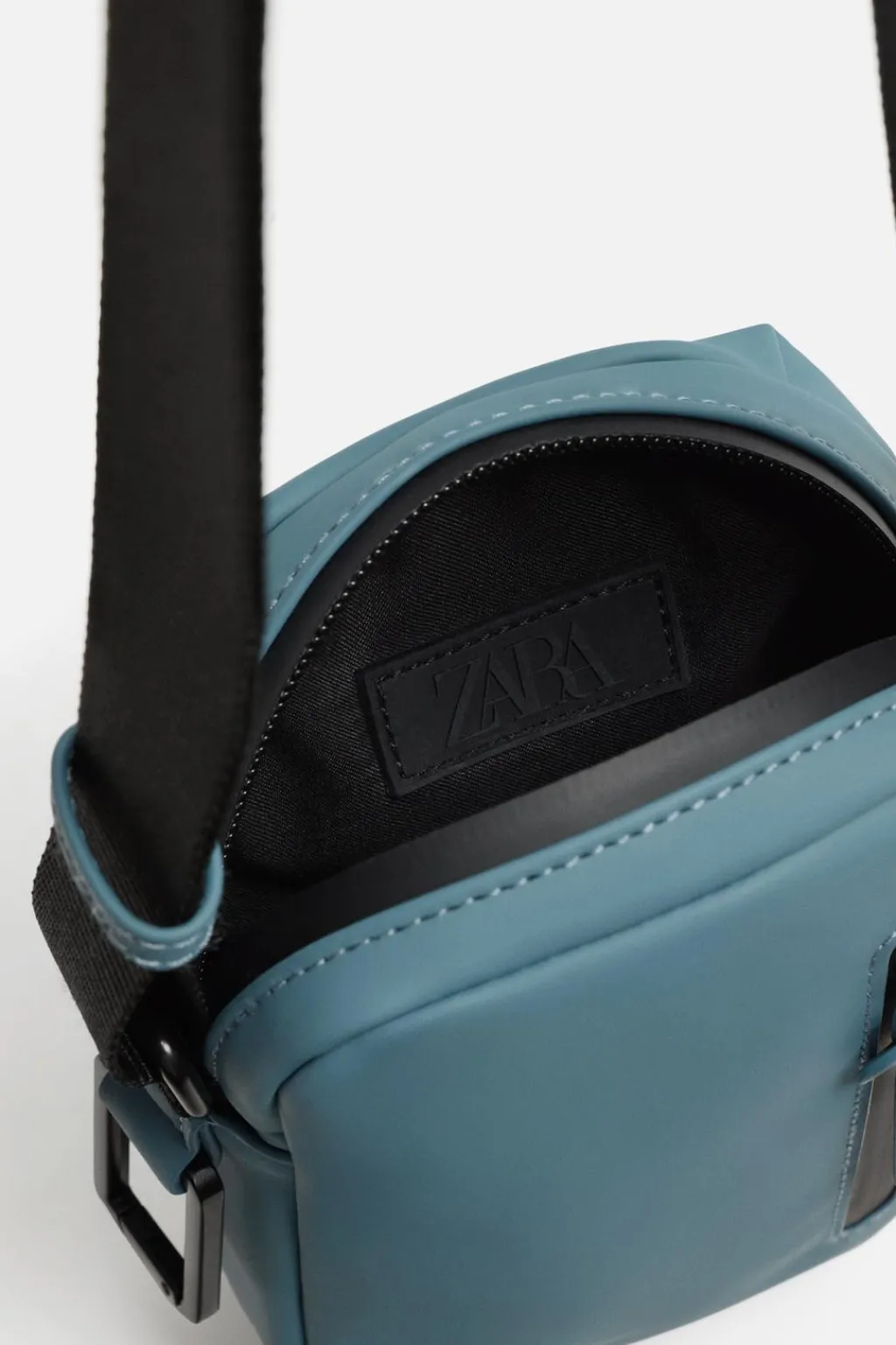 Bandolera vertical de acabado engomado. Compartimento principal con cierre mediante cremallera. Parte frontal cuenta con un bolsillo con cierre mediante cremallera. Asa de hombro ajustable a tono.