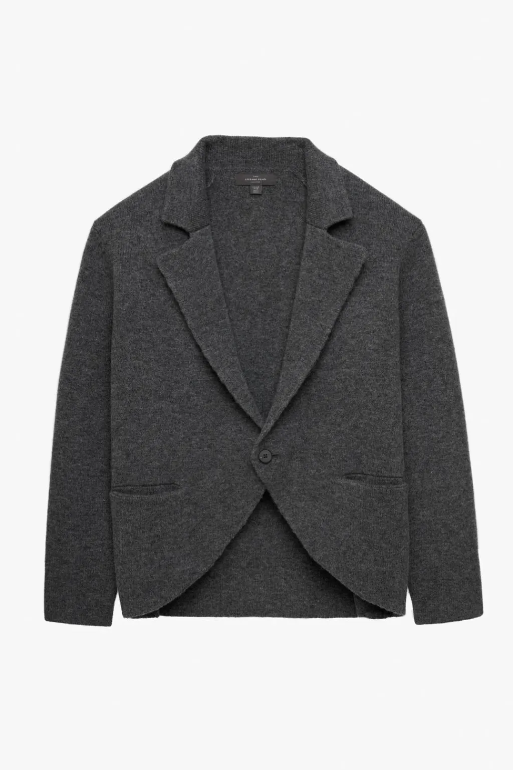 Blazer relaxed fit de punto tejido en hilatura de lana con textura. Cuello con solapas de muesca y manga larga. Bolsillos frontales de vivo. Bajo asimétrico. Cierre frontal de botonadura.