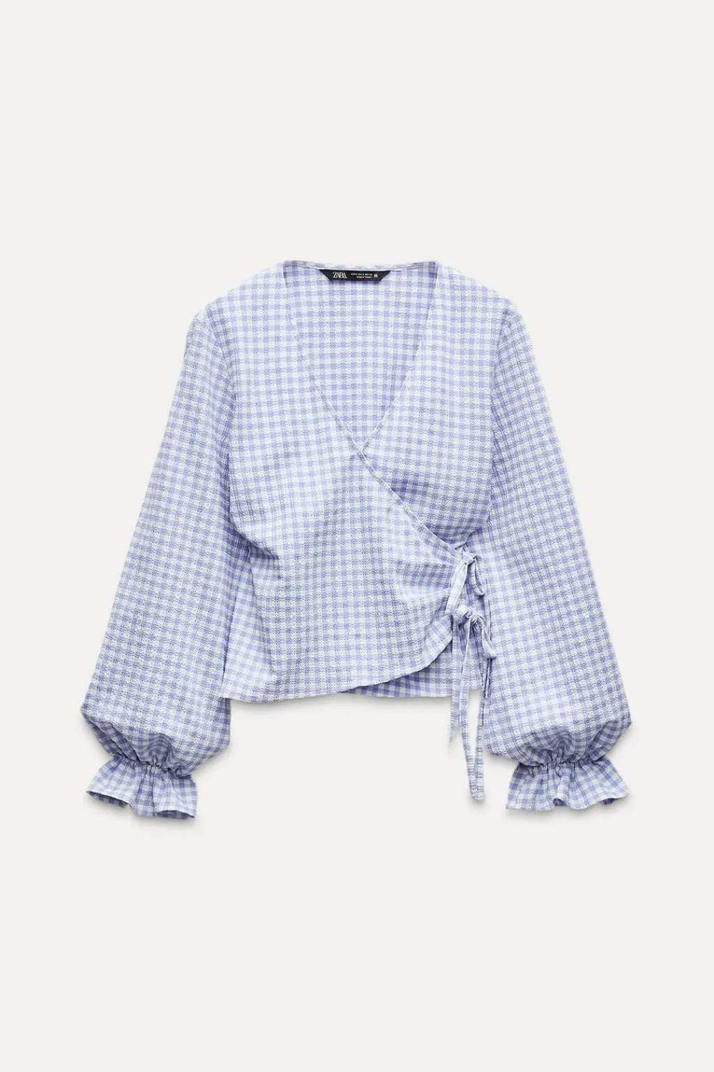 Blusa de escote pico y manga larga acabada con elástico y volante. Cierre frontal cruzado con lazos.