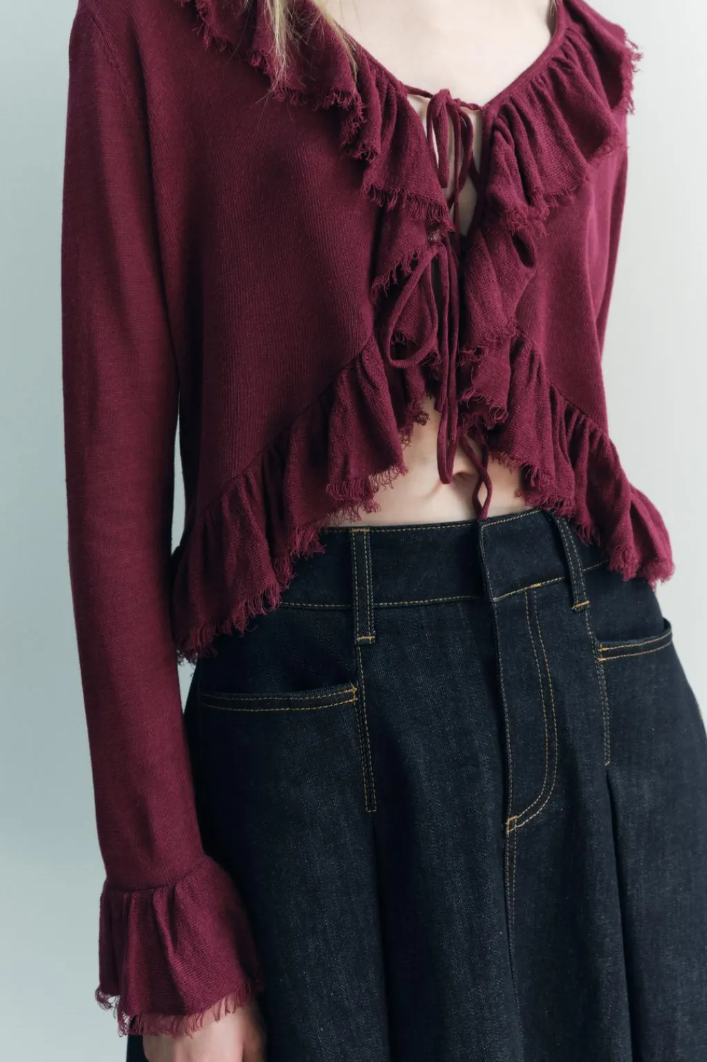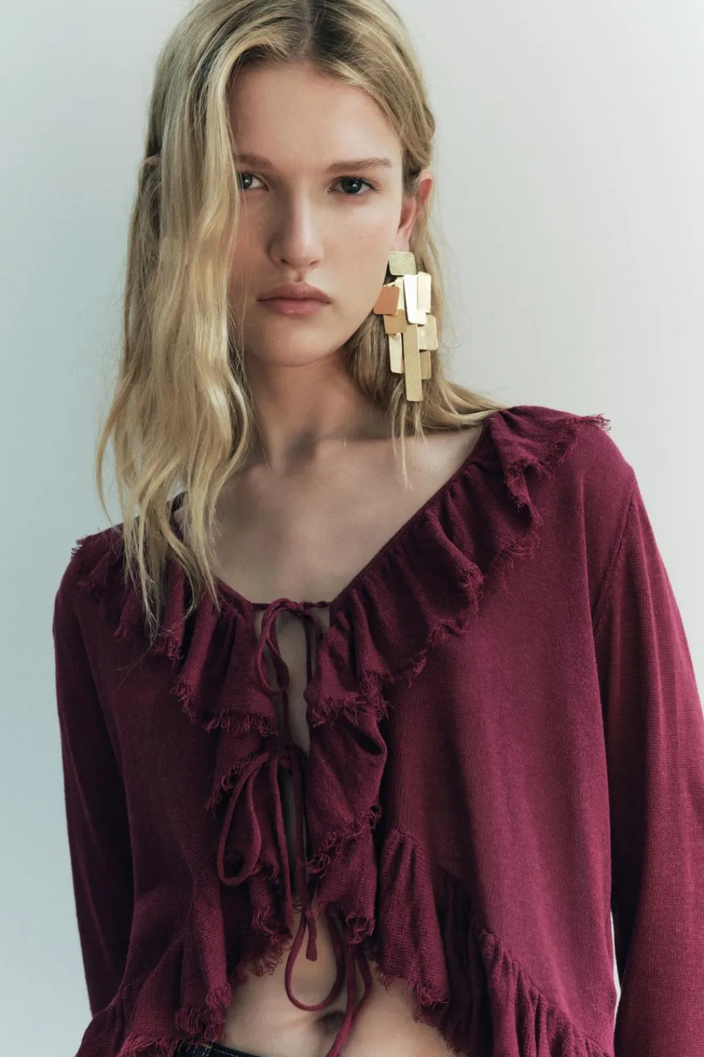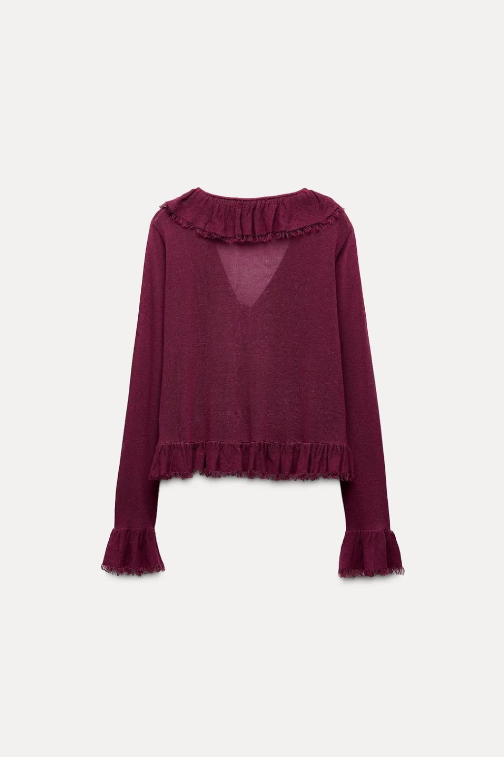 Blusa de escote pico y manga larga. Bajo asimétrico. Detalle de acabados desflecados con volantes. Cierre frontal con lazos.