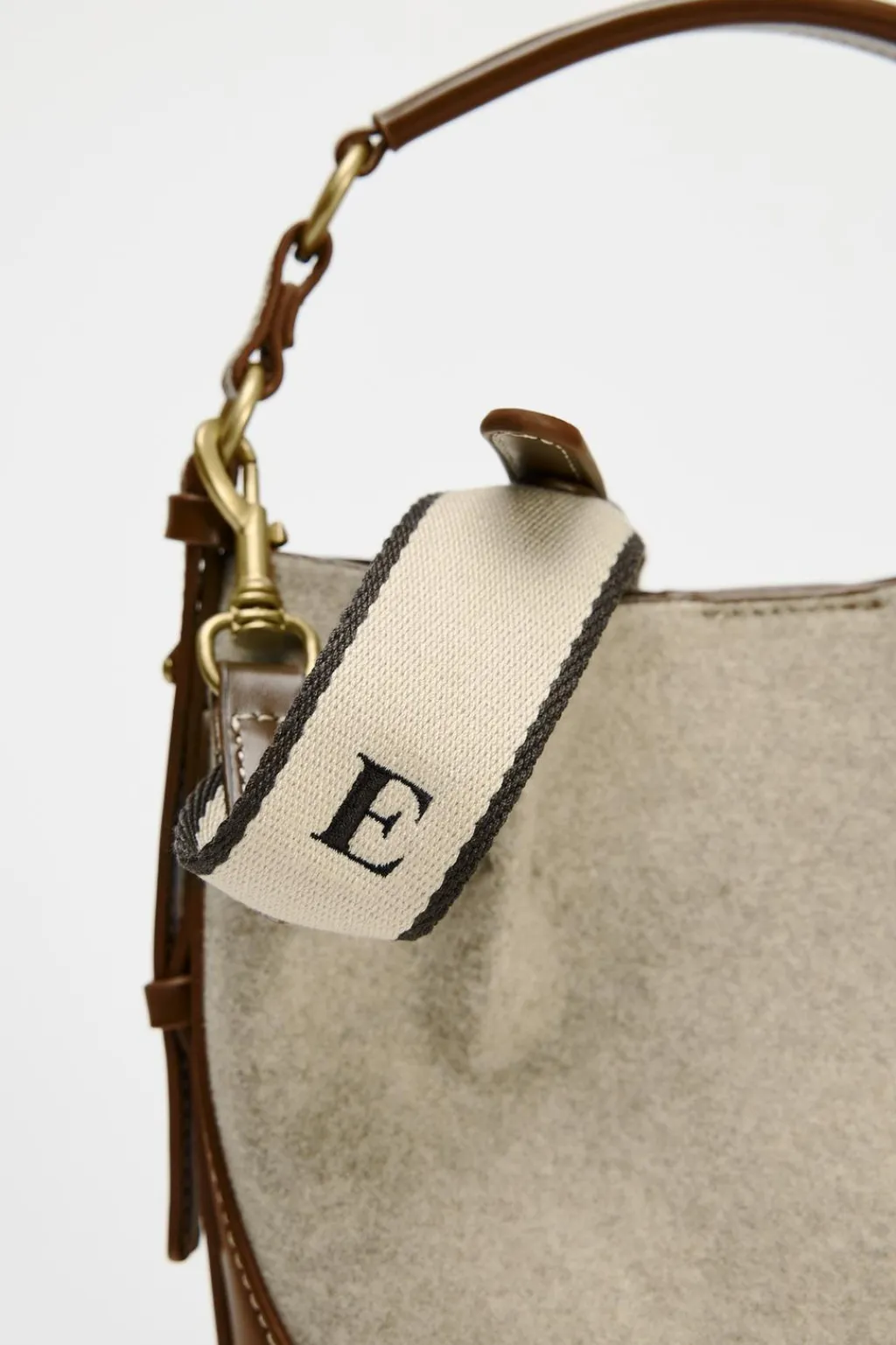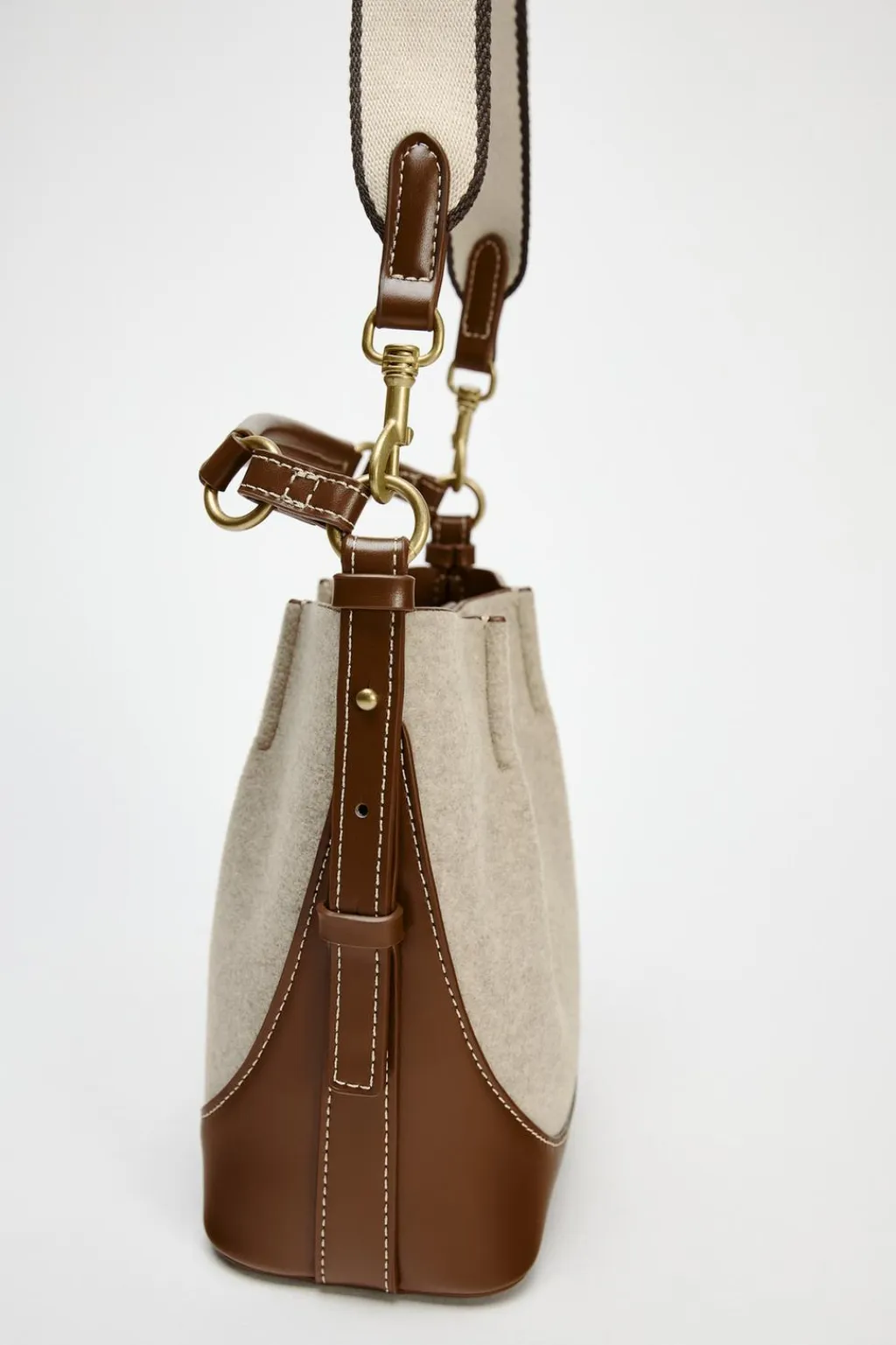 Bolso formato saca en tejido con pespuntes en contraste. Asa de mano y doble asa bandolera ajustable y extraíble. Cartera con bolsillo extraíble. Cierre mediante imán.