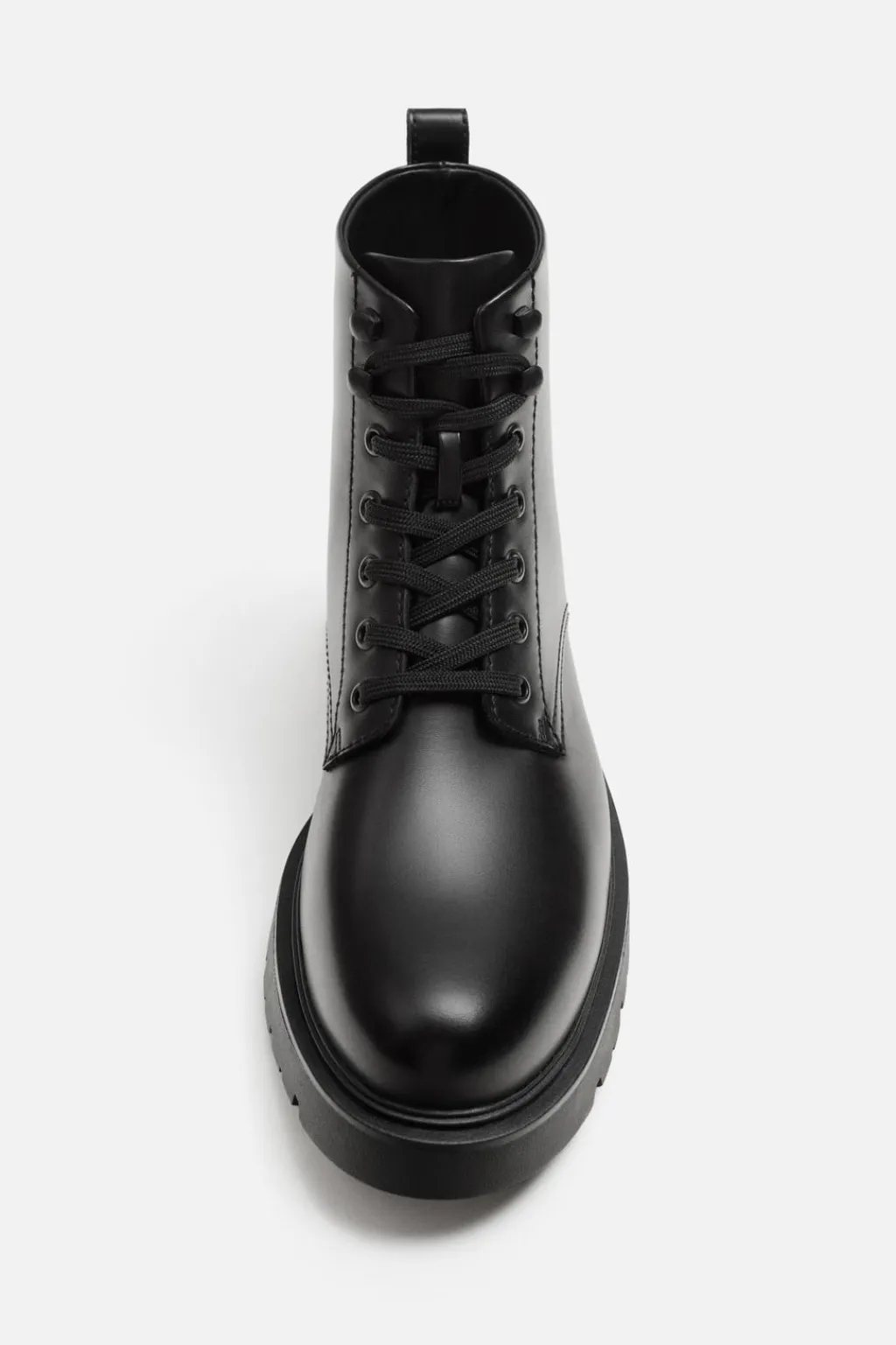 Bota con cordones. Tirador en la parte trasera para facilitar el calce. Suela con volumen y piso track.