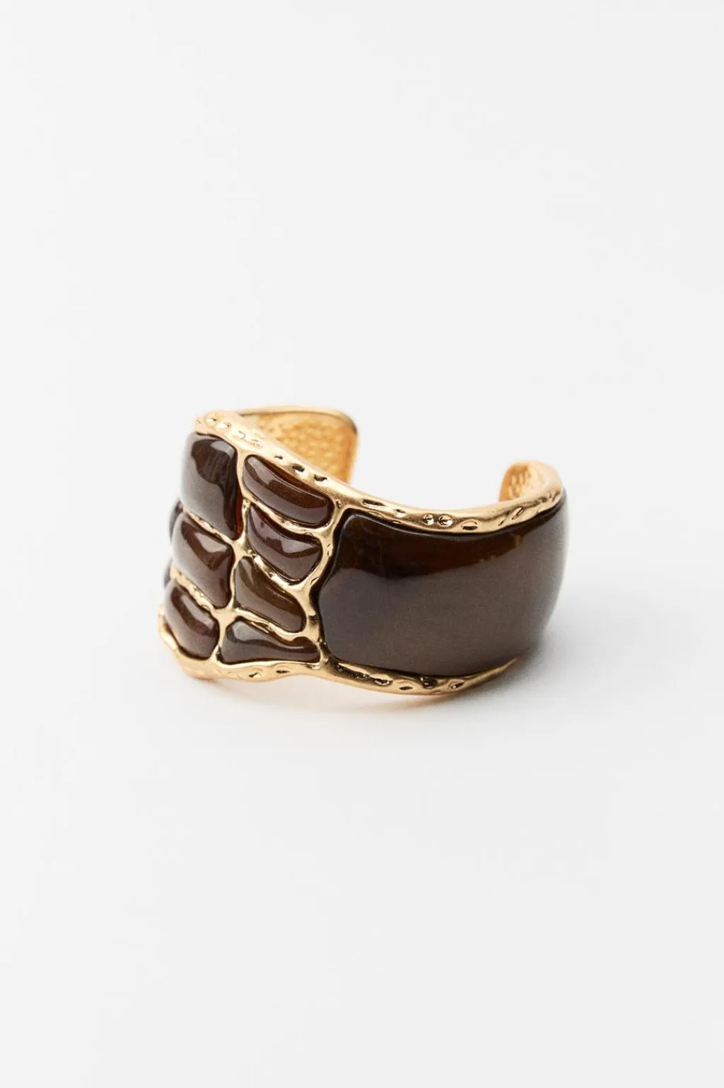 Brazalete metálico rígido labrado con aplicación de piezas en diferentes formas y tamaños realizadas en resina a contraste.