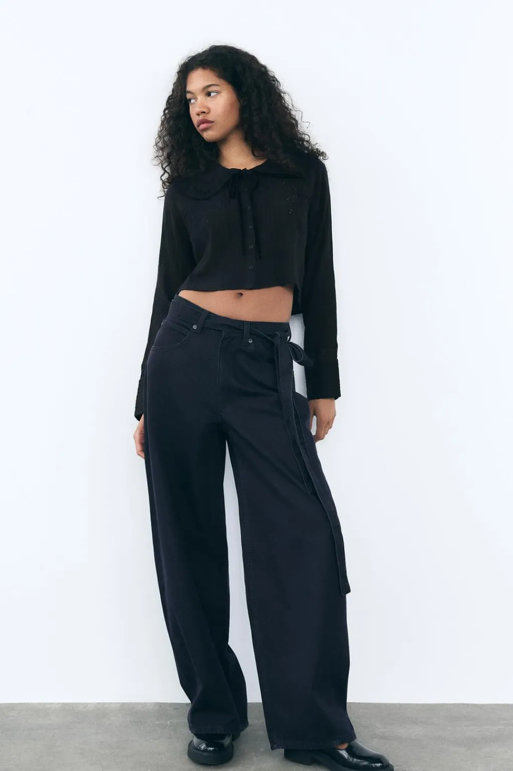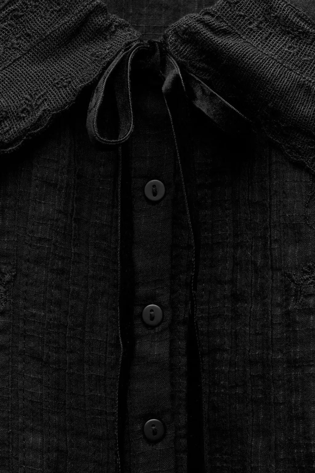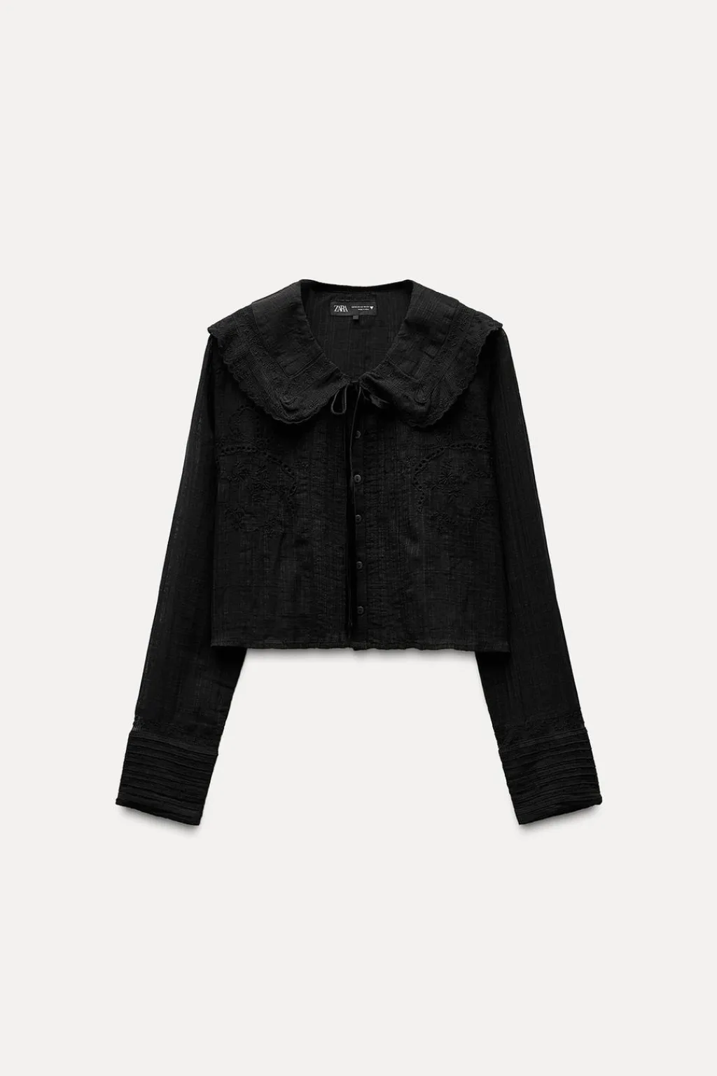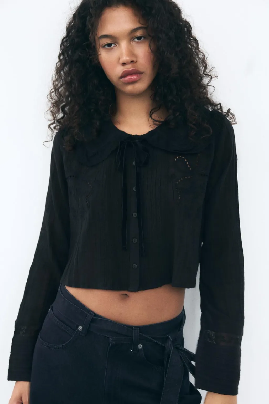 Camisa de cuello bobo con lazo en terciopelo y manga larga. Detalle de encaje combinado a tono. Cierre frontal con botones.