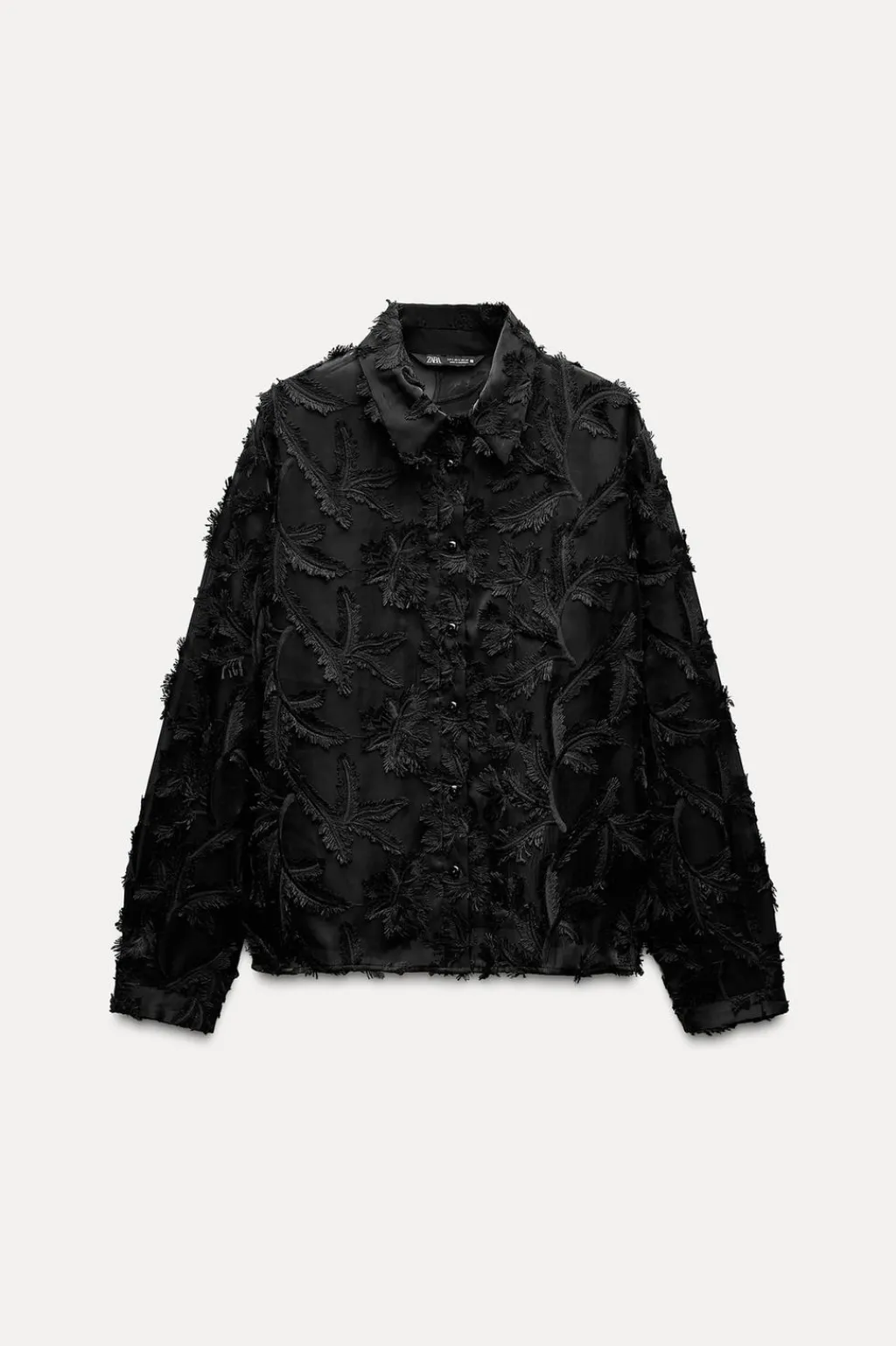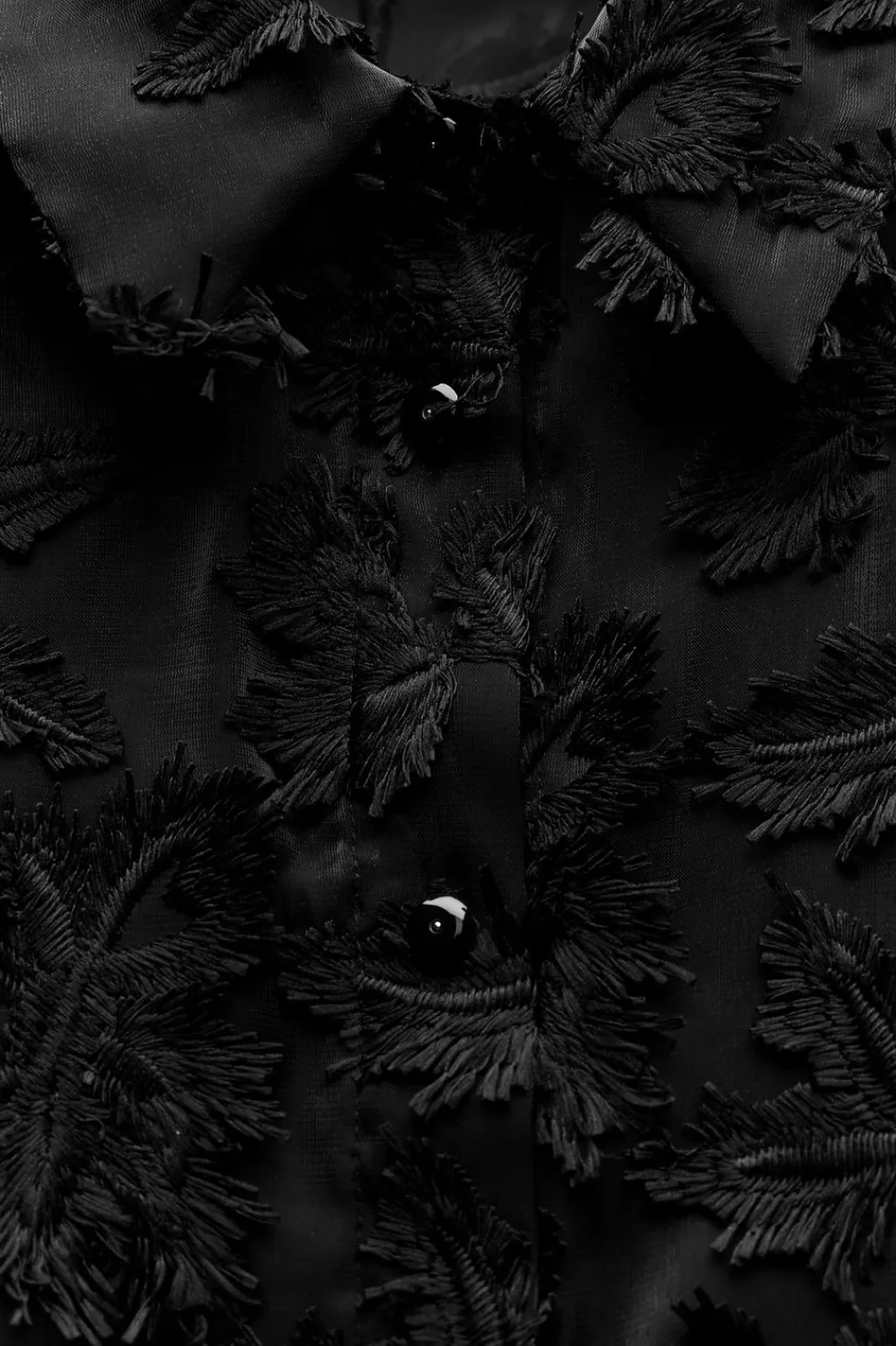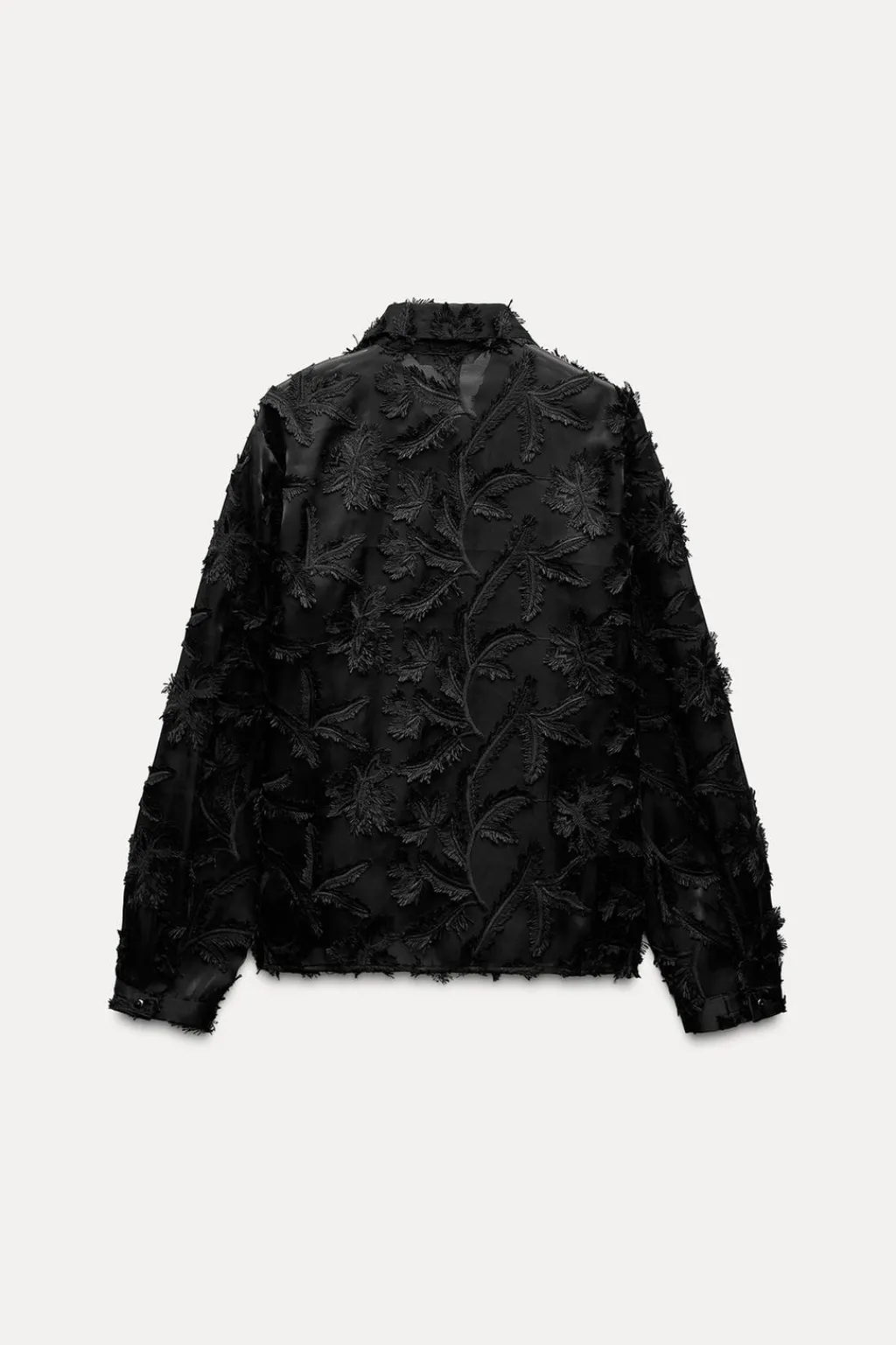 Camisa de cuello solapa y manga larga. Detalle de tejido desflecados. Cierre frontal con botones.