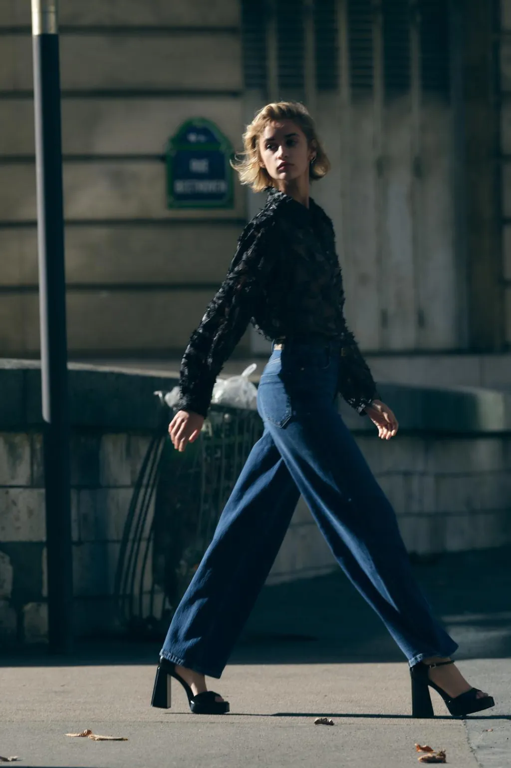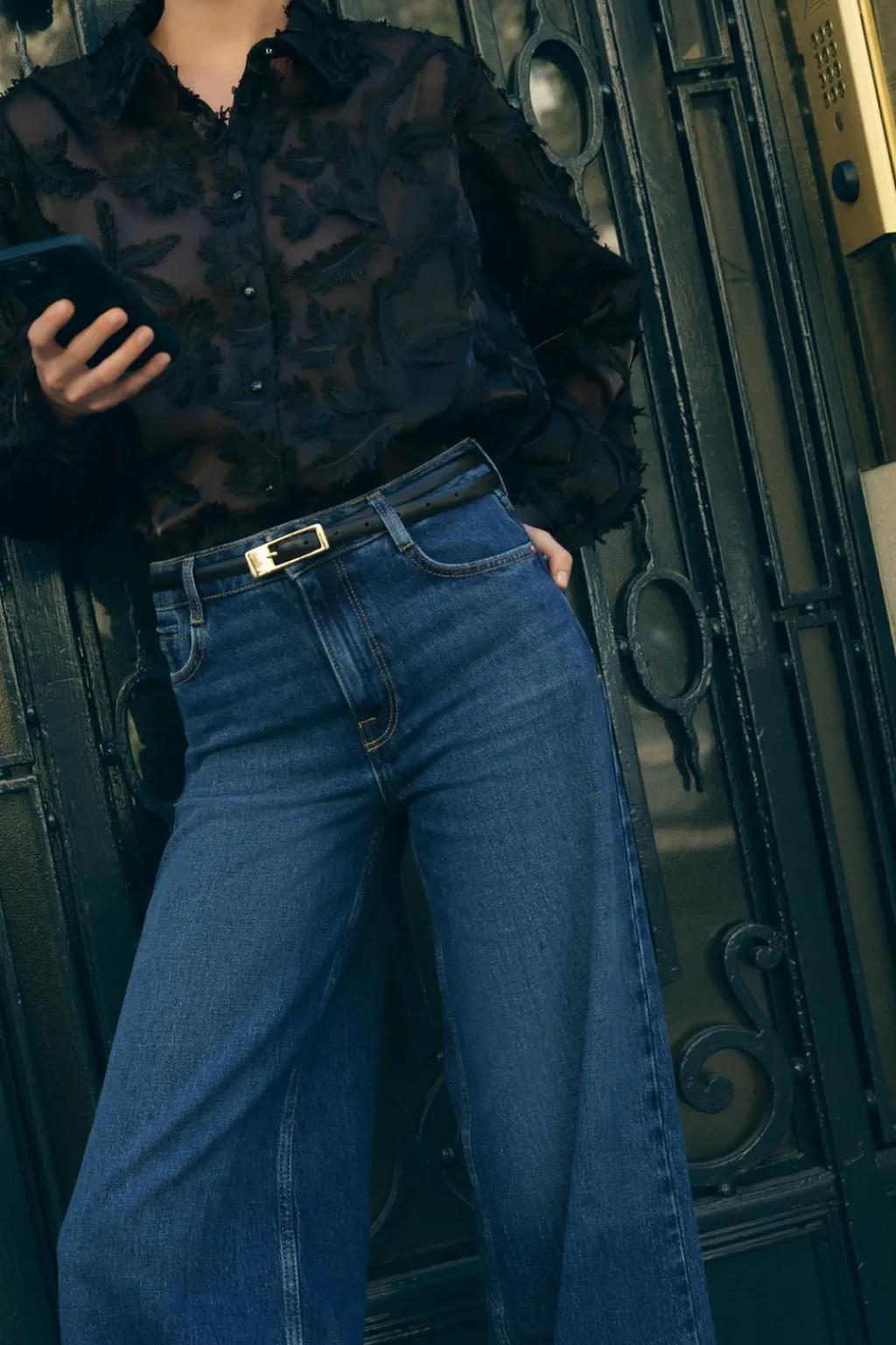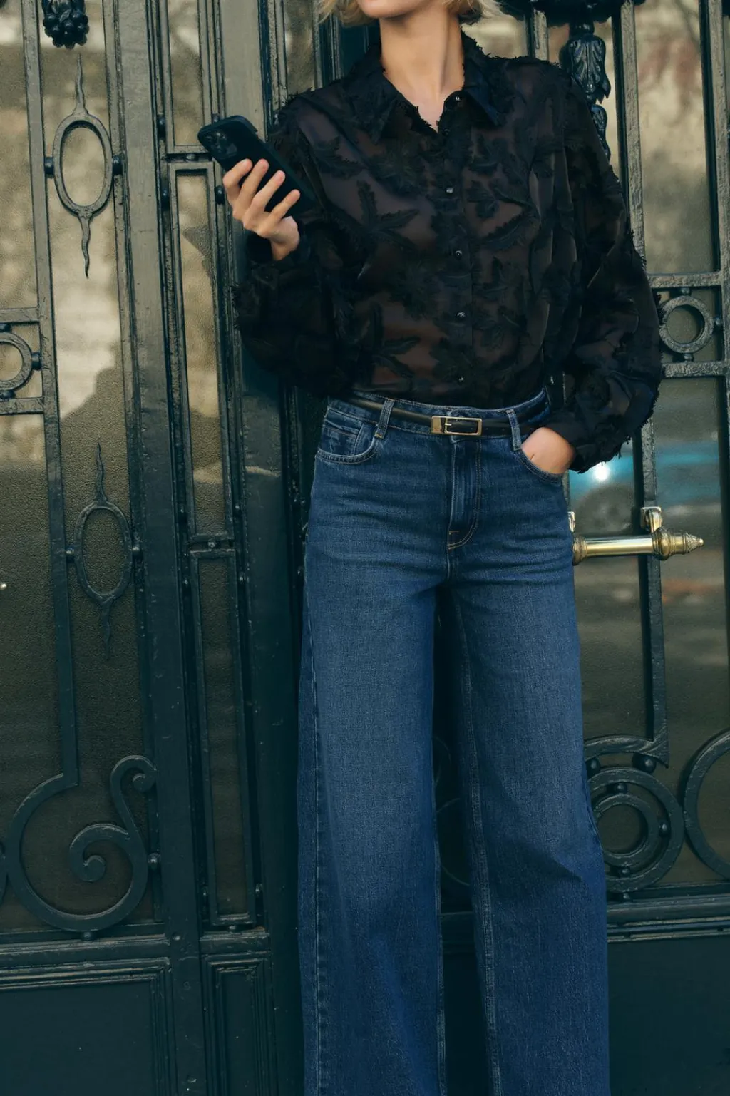 Camisa de cuello solapa y manga larga. Detalle de tejido desflecados. Cierre frontal con botones.