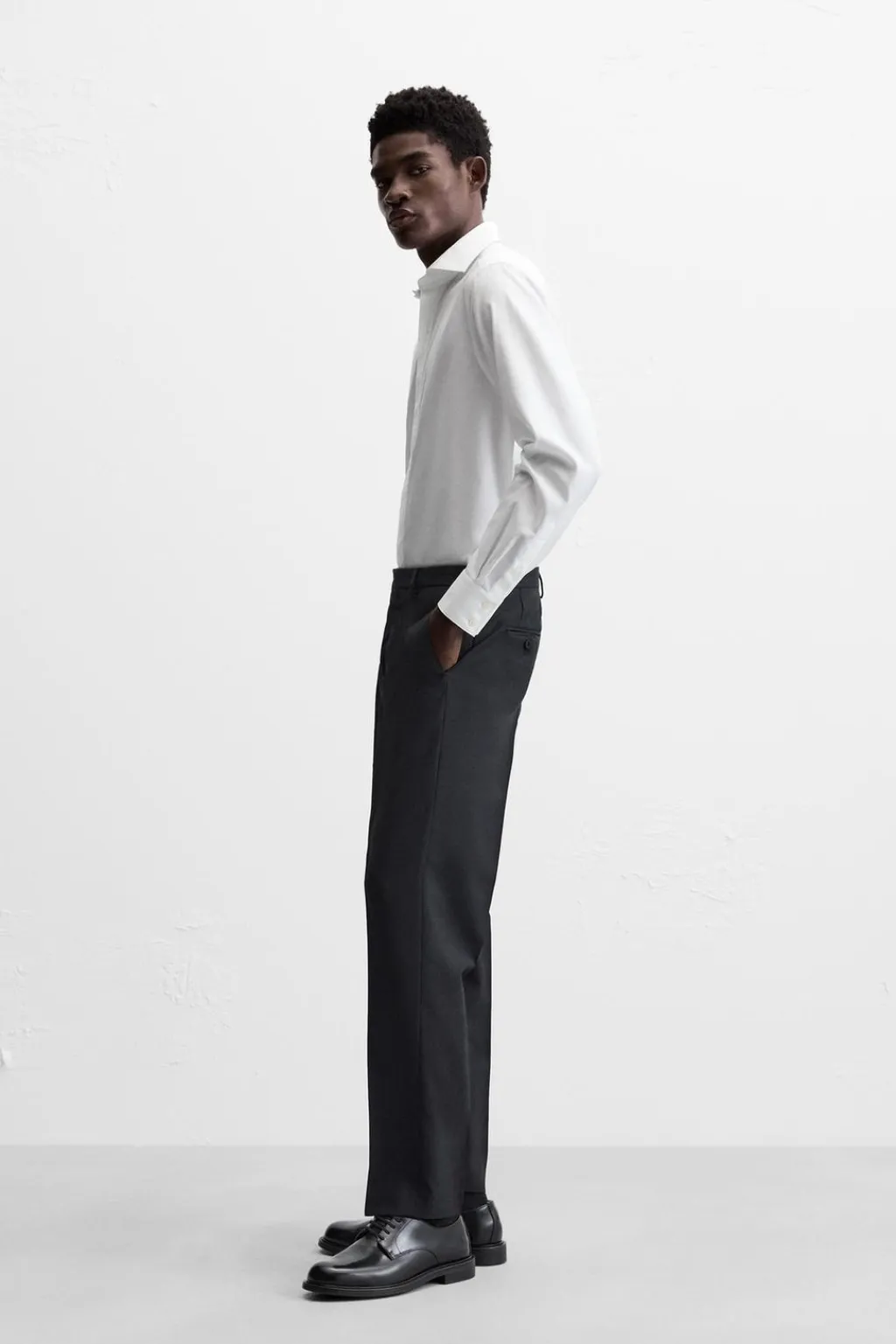 Camisa slim fit confeccionada en tejido ligero de algodón. Cuello italiano abierto y manga larga acabada en puño con botón. Cierre frontal de botonadura oculta por solapa.
