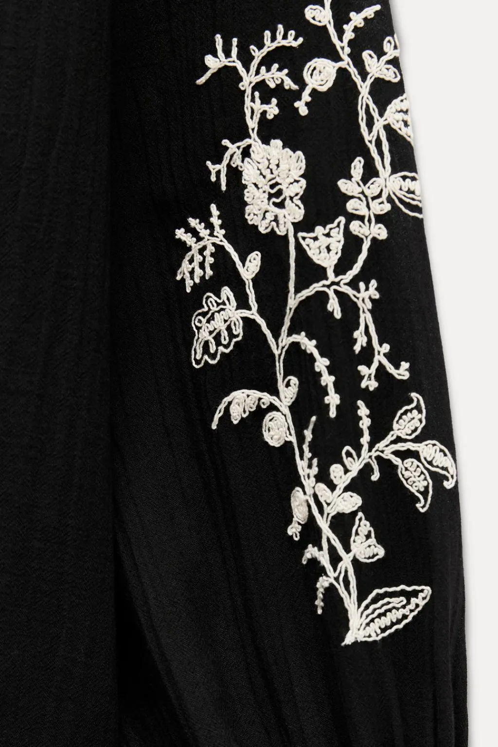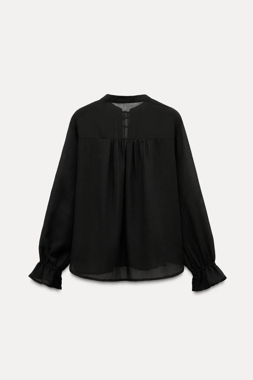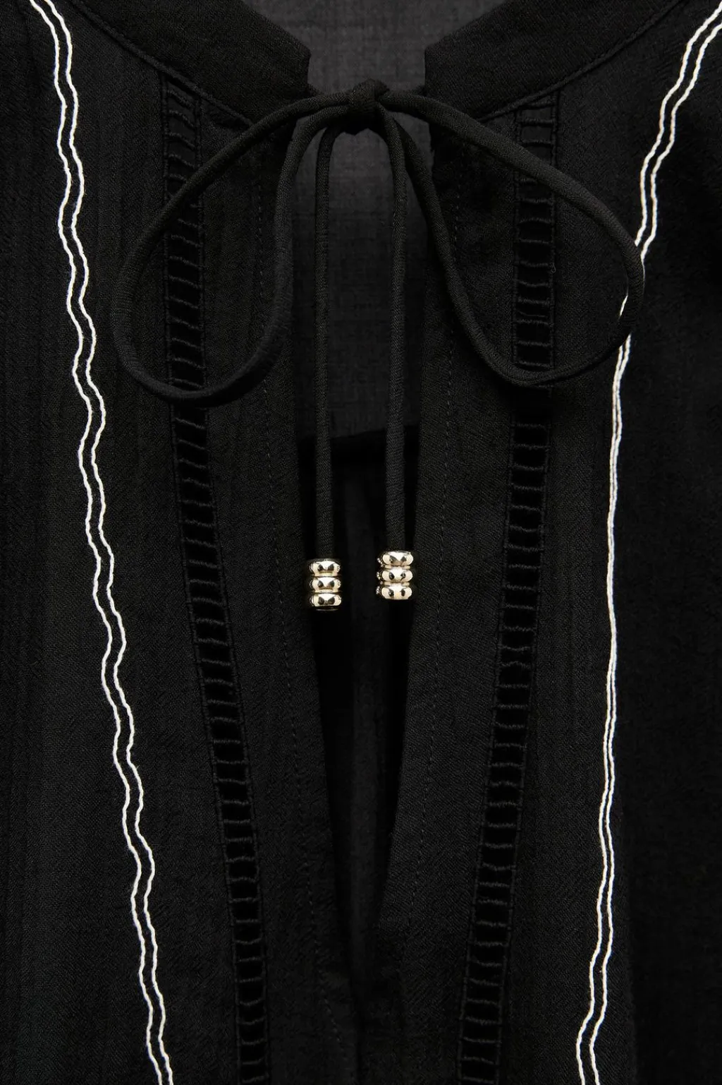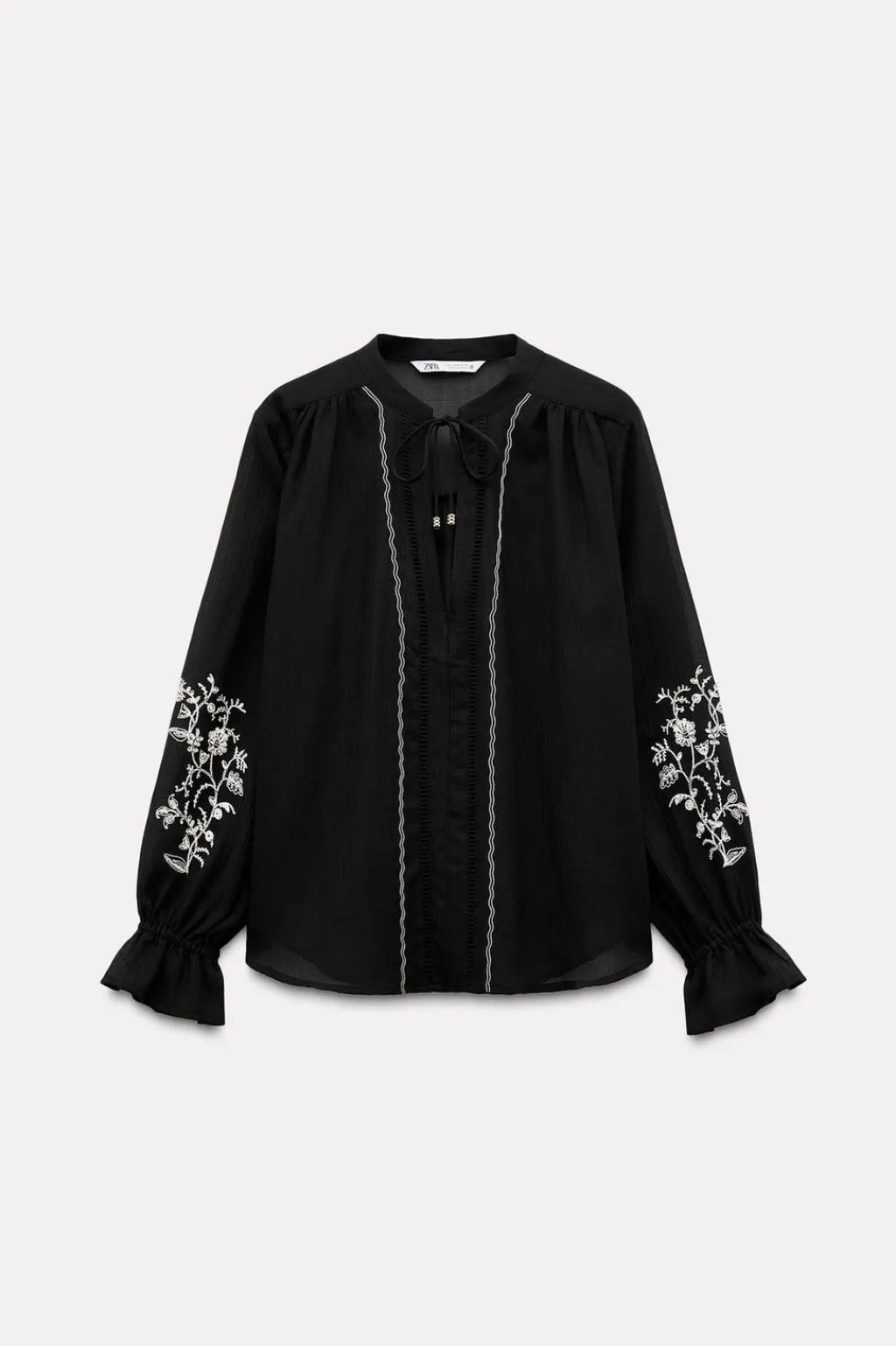 Camisa de cuello redondo con cordón. Escote pico y manga larga acabada con elástico y bordados a contraste. Detalle de entredoses y bordados delanteros.