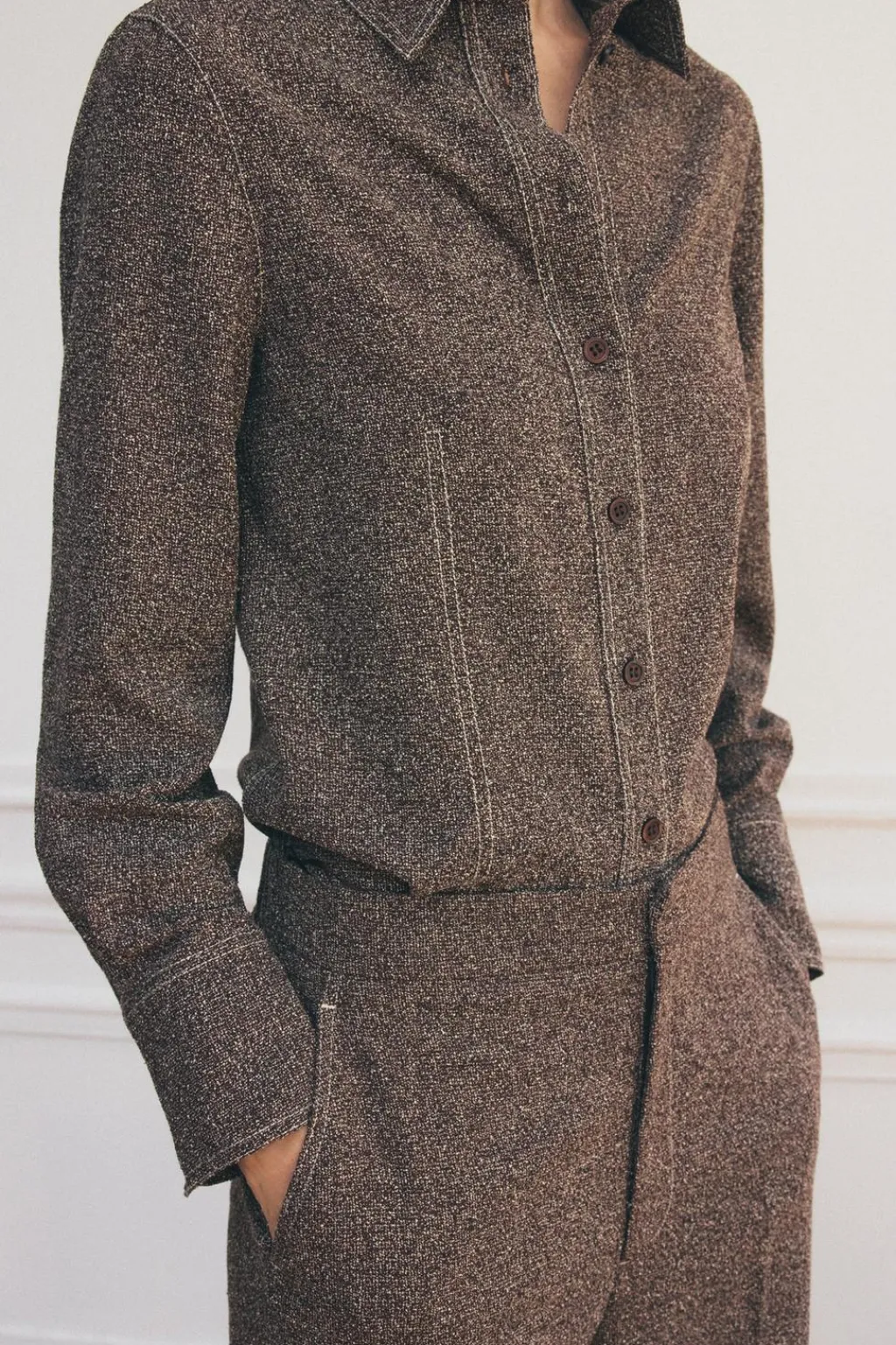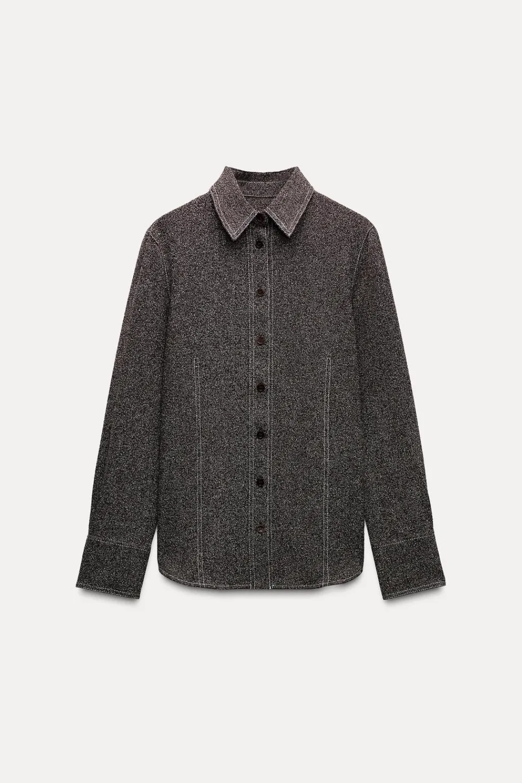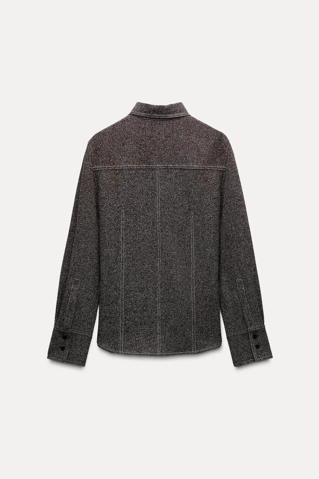 Camisa confeccionada en hilatura con viscosa 30%. Cuello solapa y manga larga acabada en puño y botones. Detalle de pespuntes marcados combinados a contraste. Cierre frontal con botones.