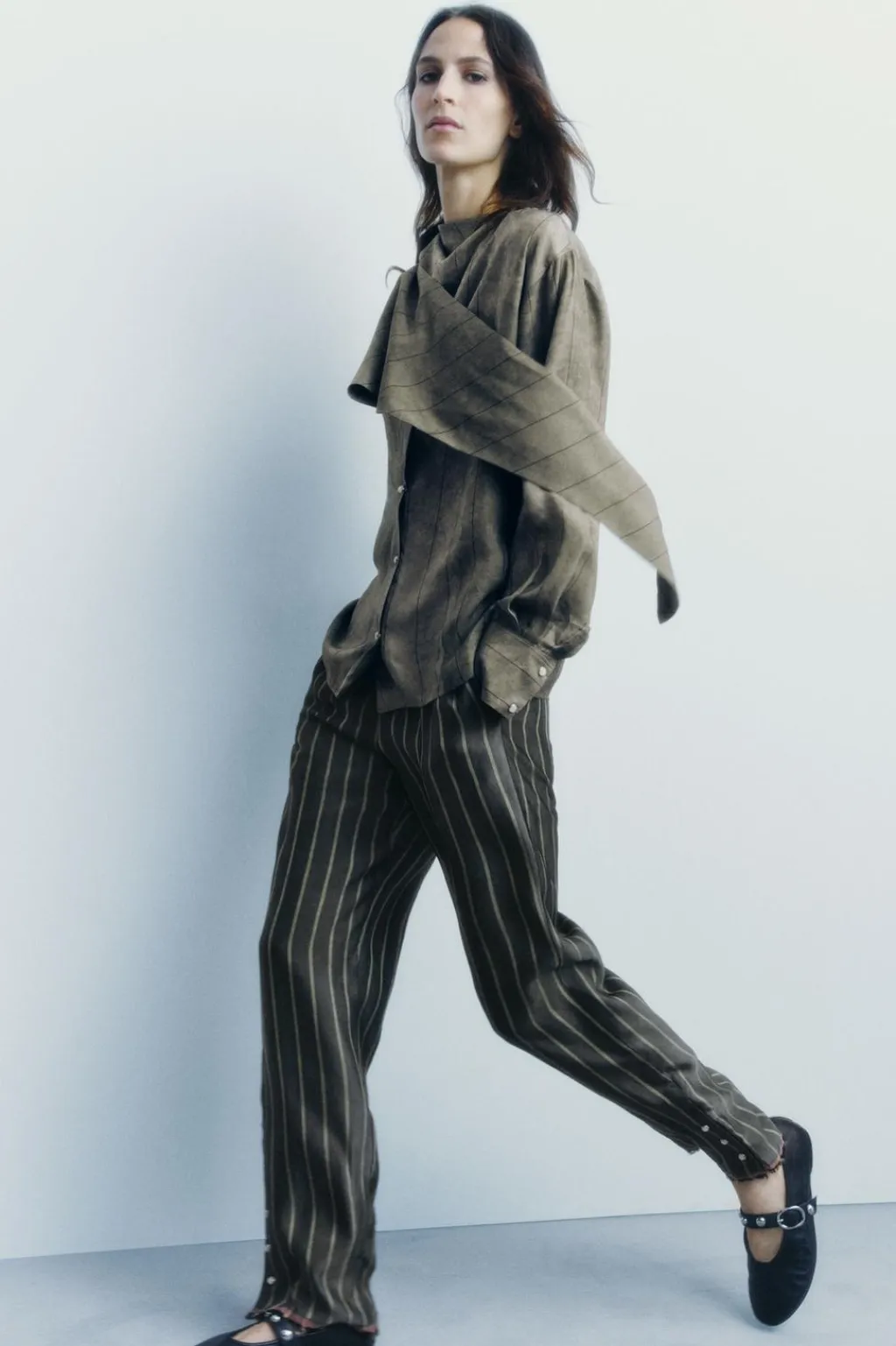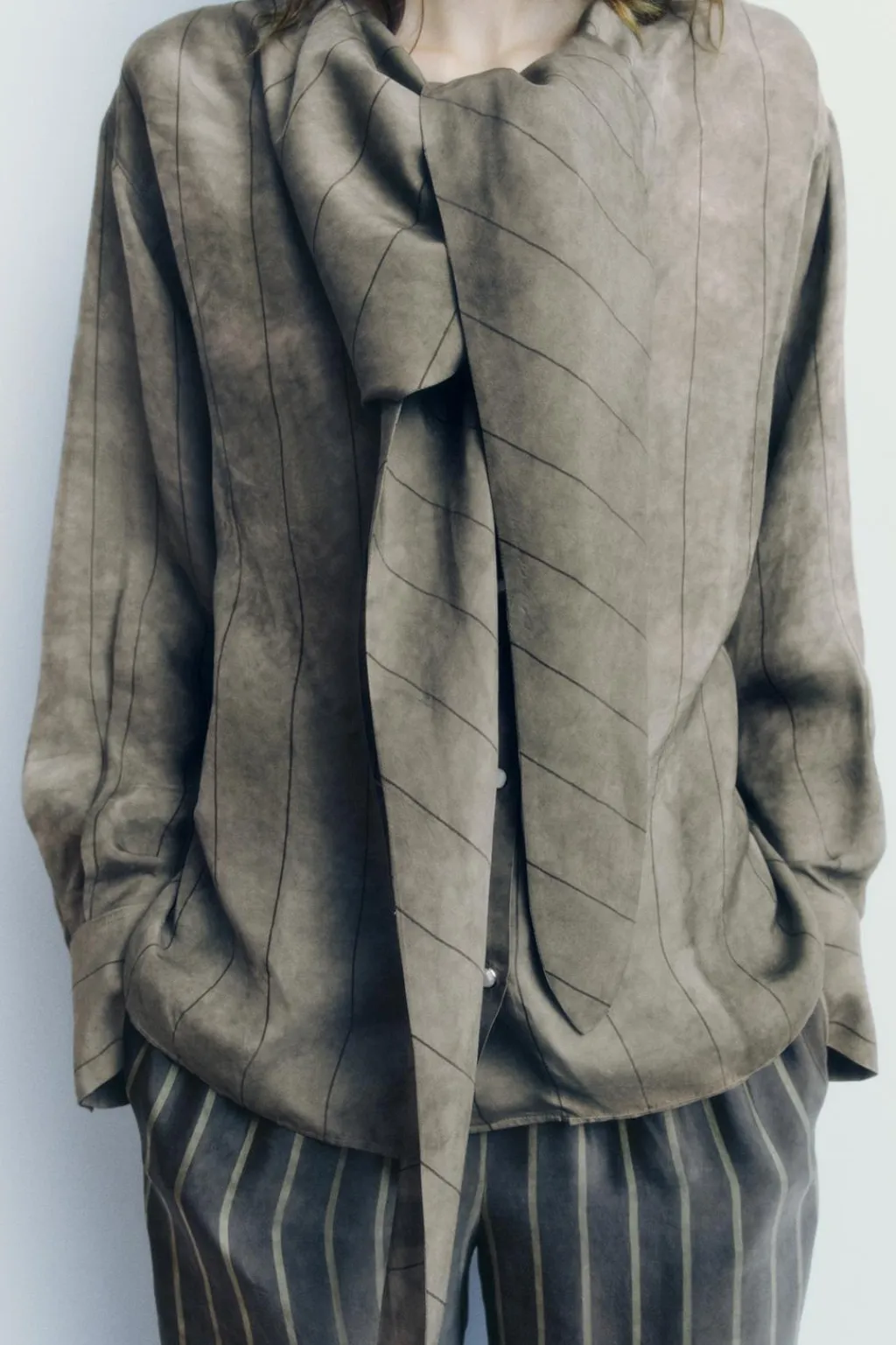 Camisa confeccionada en hilatura de cupro 100%. Cuello cruzado con bandana en mismo tejido ajustable con lazada. Manga larga acabada en puño con pliegues. Cierre frontal con botones a presión.