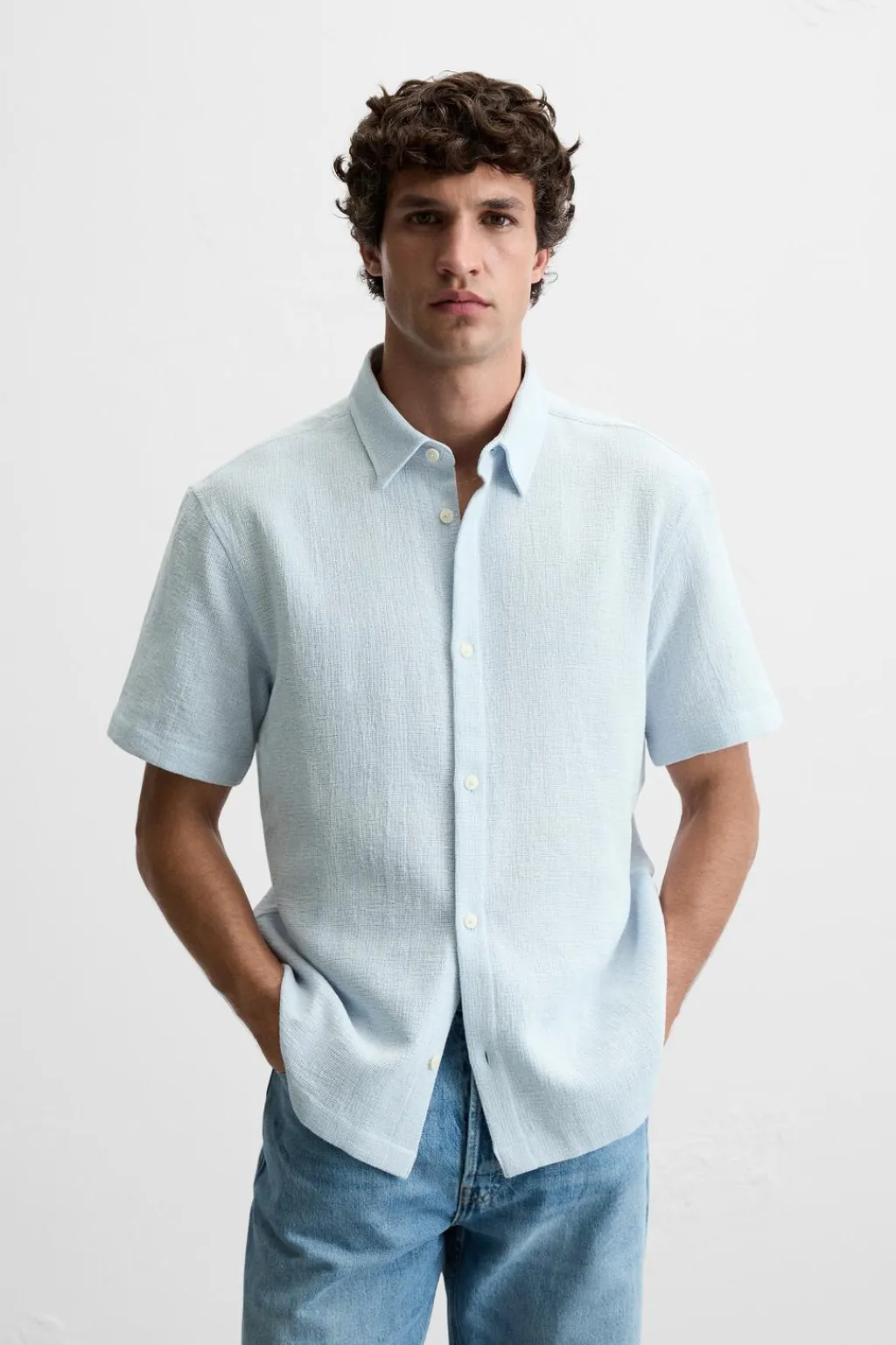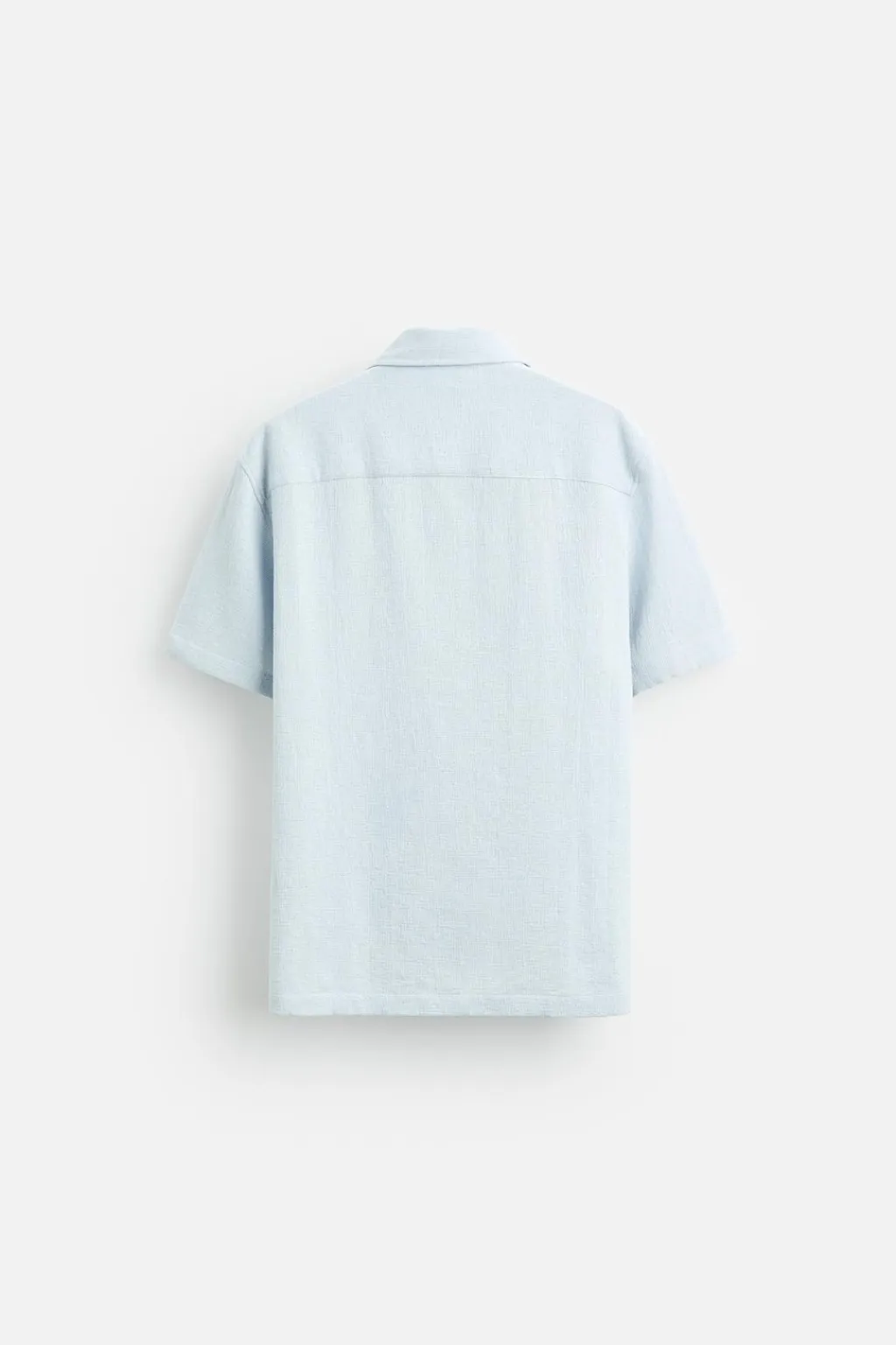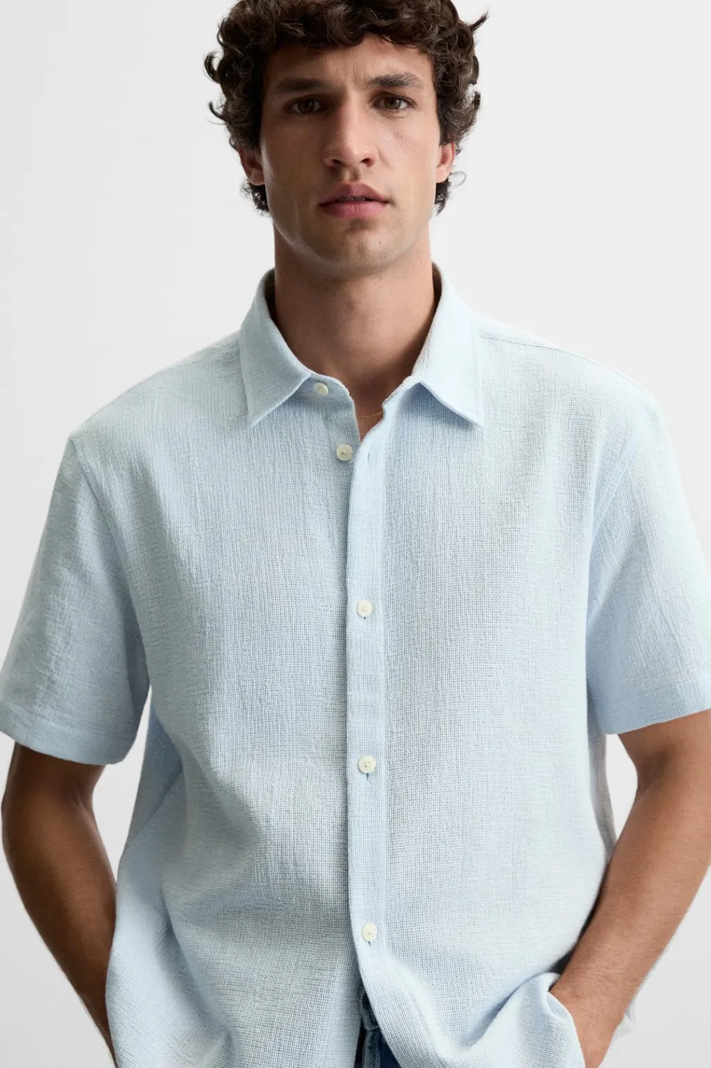 Camisa relaxed fit confeccionada en tejido con mezcla de algodón. Cuello solapa y manga corta. Bajo con aberturas laterales. Cierre frontal de botonadura.