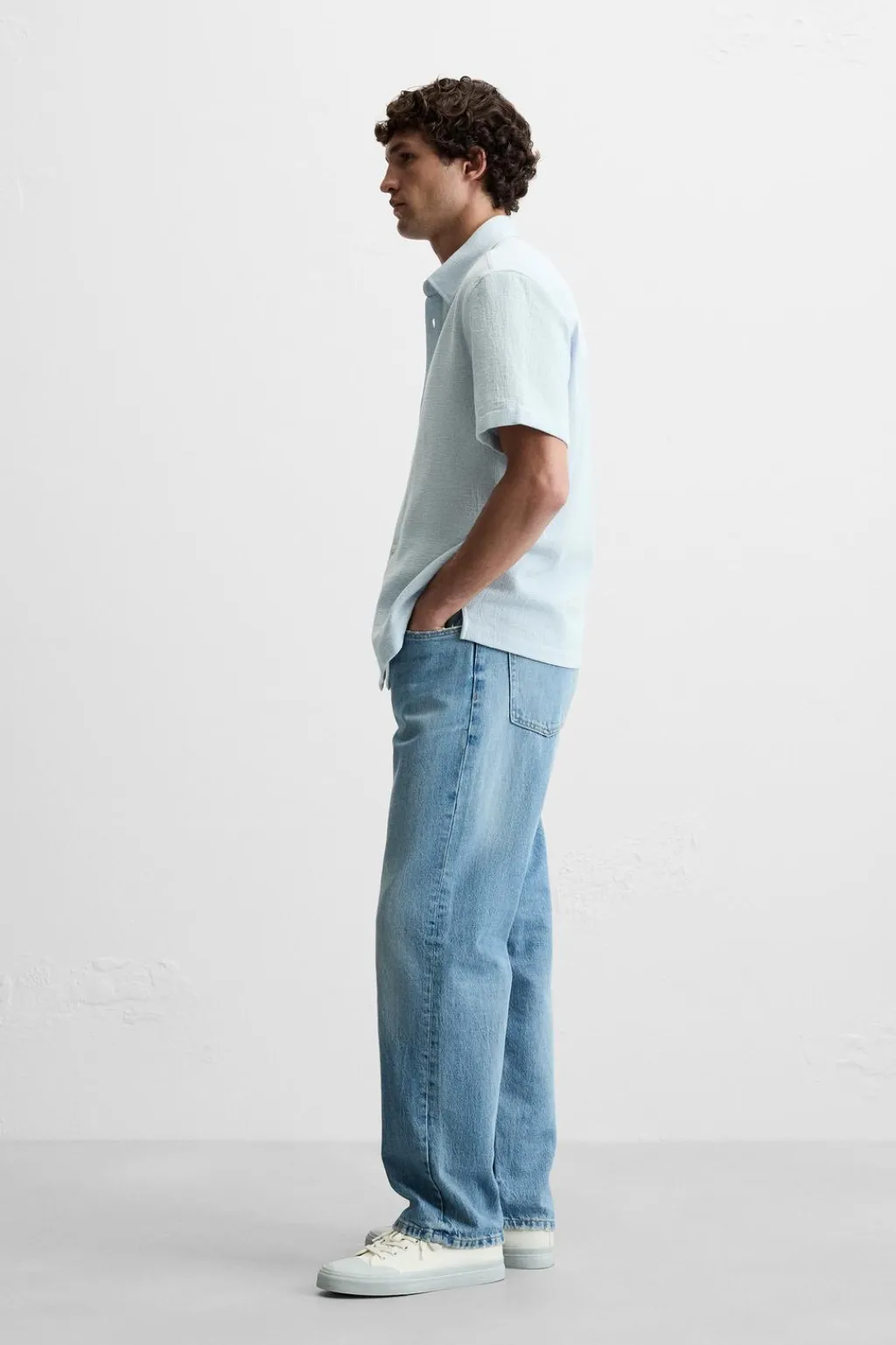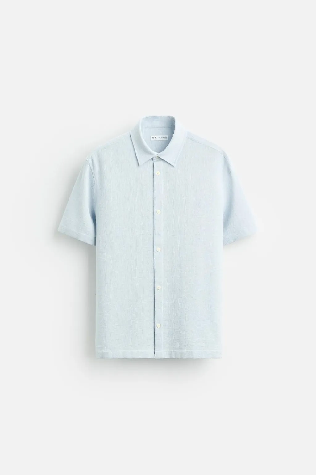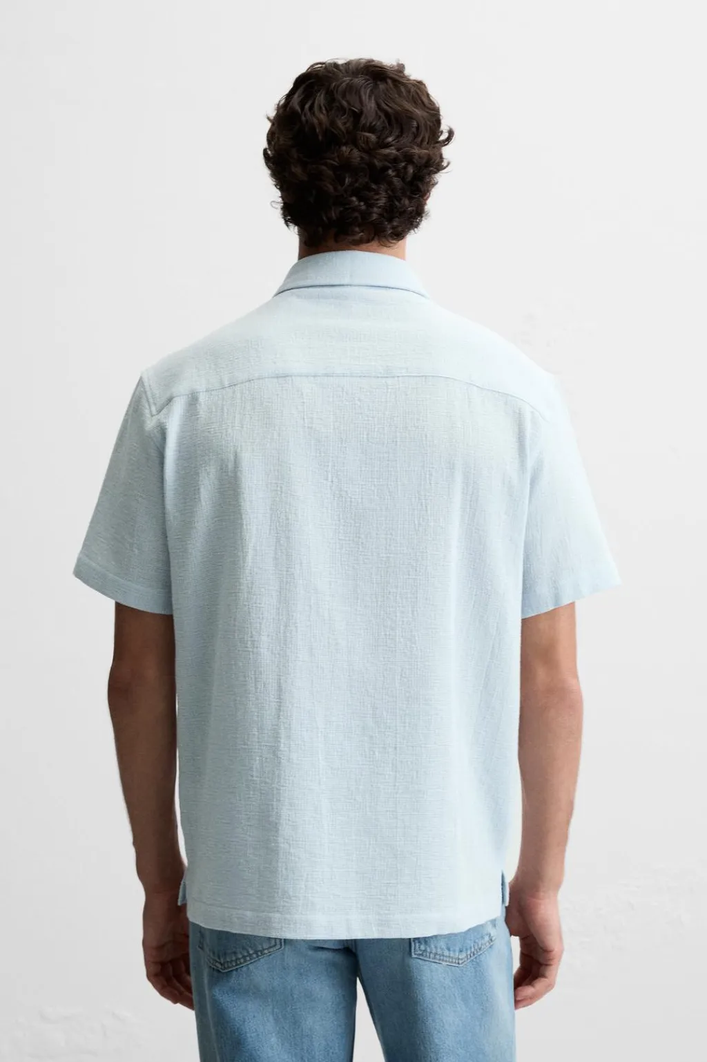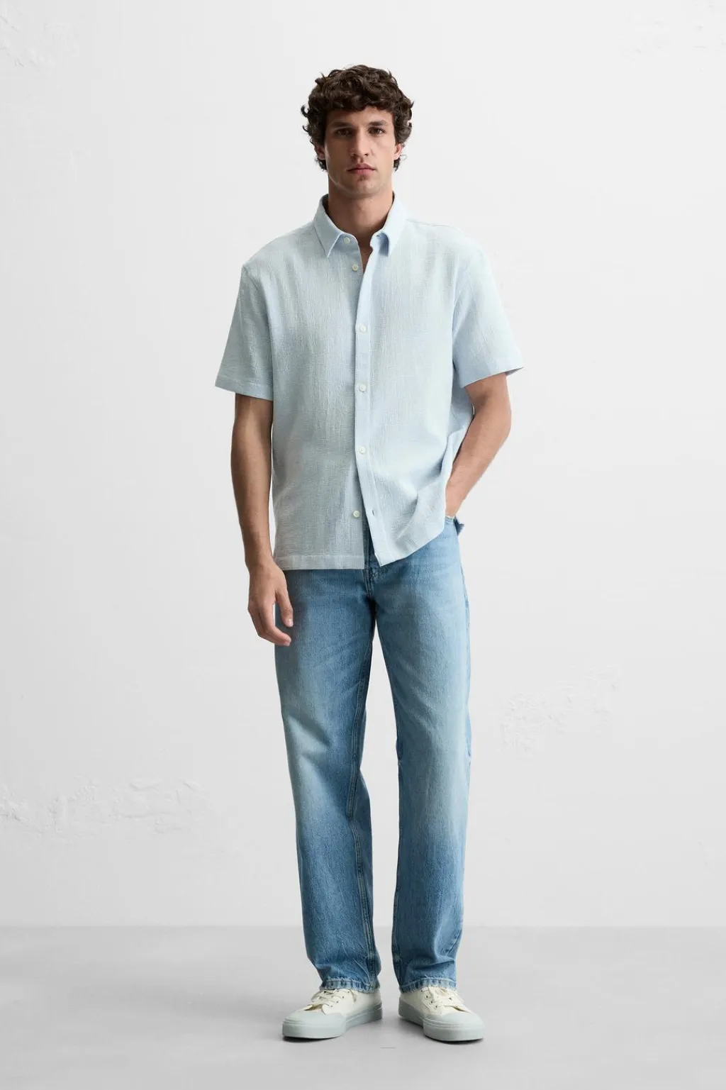 Camisa relaxed fit confeccionada en tejido con mezcla de algodón. Cuello solapa y manga corta. Bajo con aberturas laterales. Cierre frontal de botonadura.