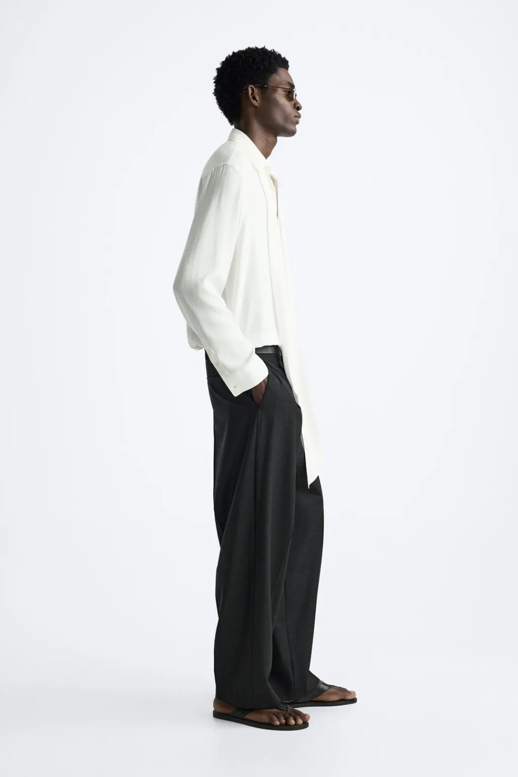 Camisa relaxed fit confeccionada en tejido de viscosa satinada. Cuello polo con abertura frontal y cierre de botonadura. Detalle de lazo en el mismo tejido. Manga larga acabada en puño con botones. Bajo asimétrico con aberturas laterales.